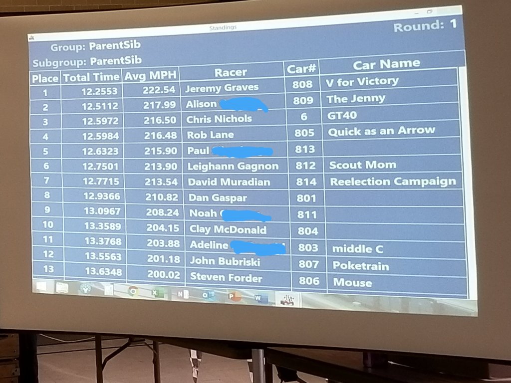 The adult and sibling race followed and the excitement continued to fill the room. Congratulations to the winners of the top 3 fastest cars.