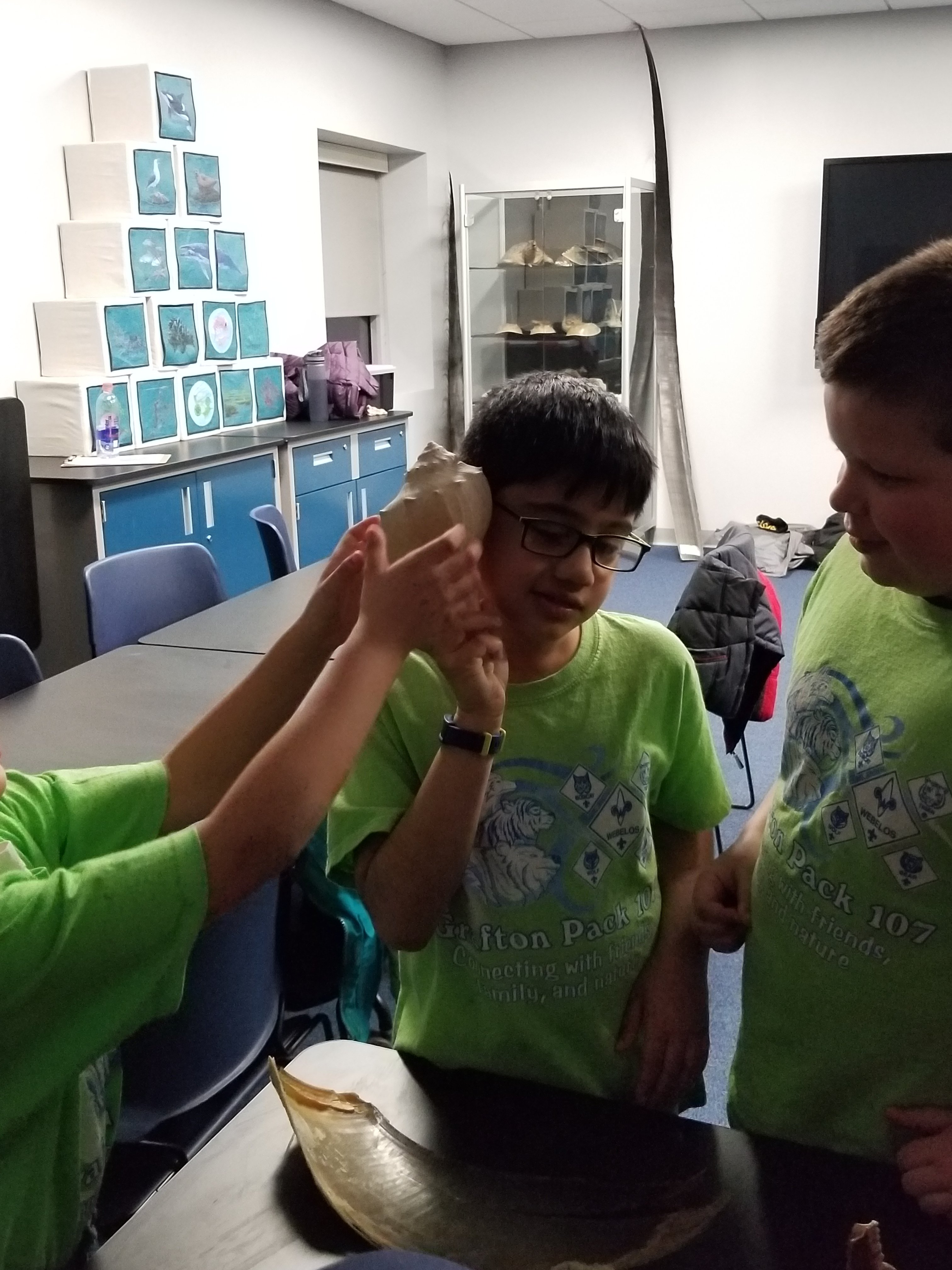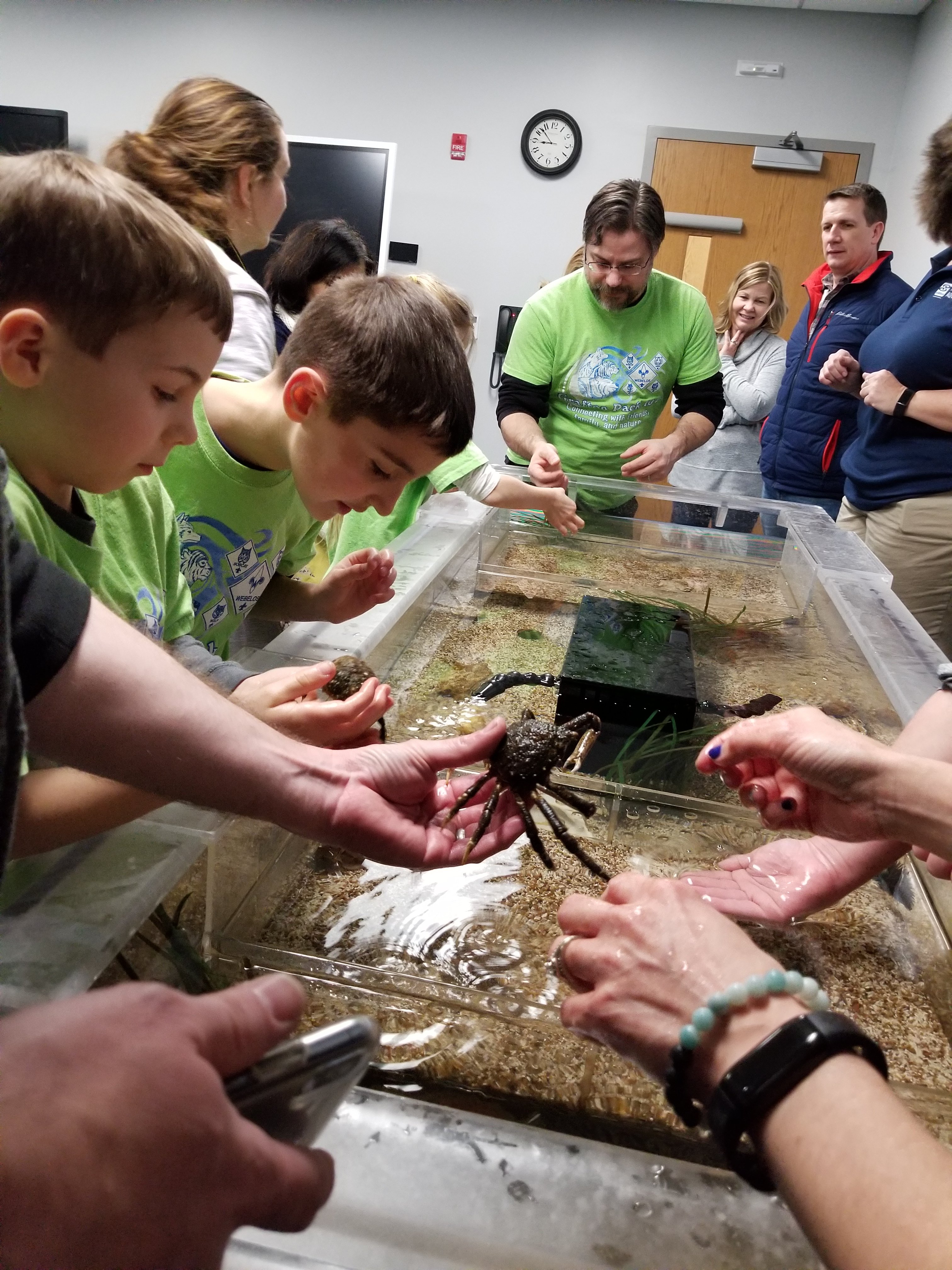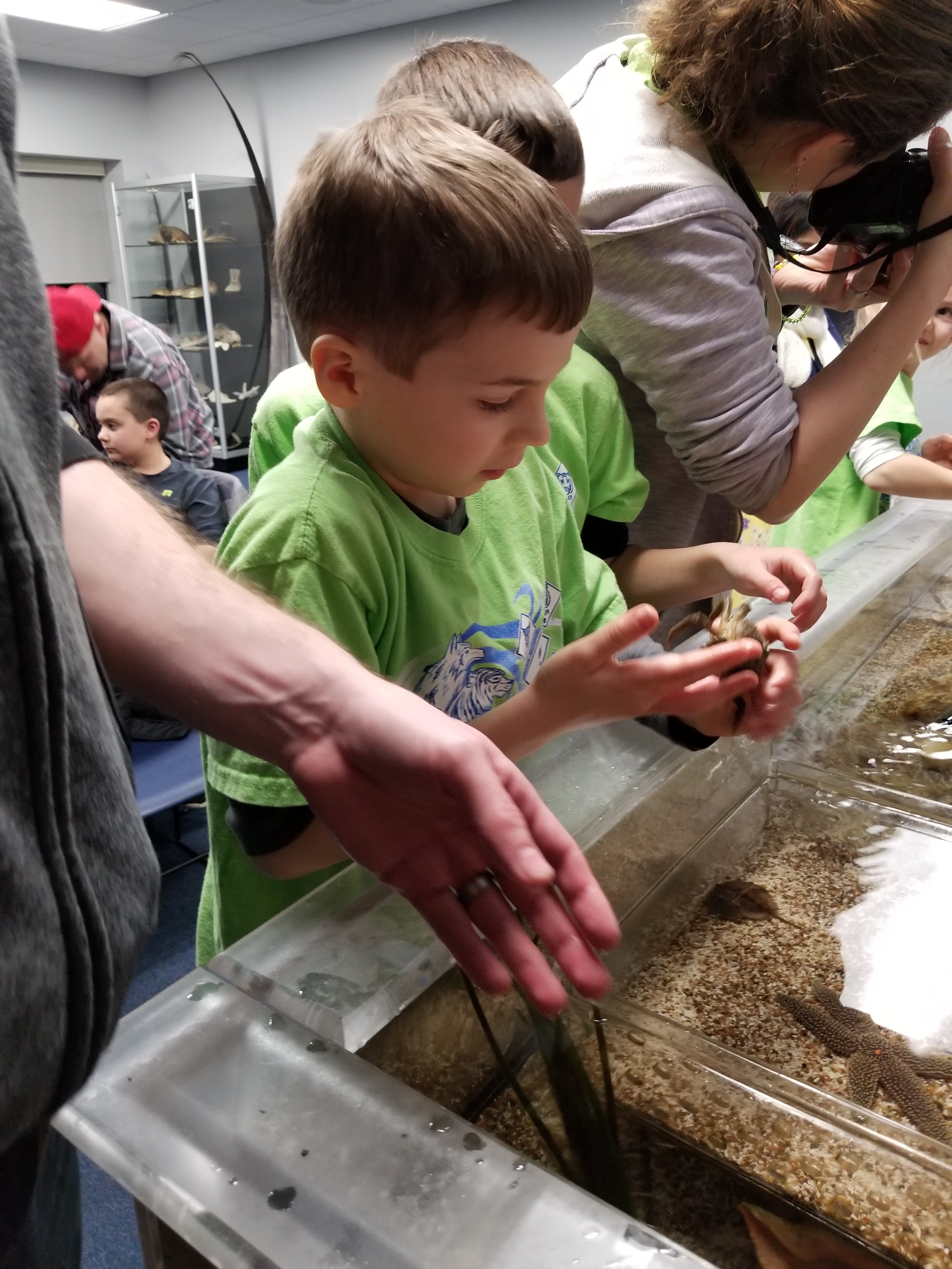 At the Invertebrates class, the cub scouts learned about the sea creatures which have different exoskeletons. They had the opportunity to touch and feel a live sea urchin, spider crab, sea star, green crabs, and horseshoe crab to name a few. They also had the opportunity to explore different exoskeletons and shells.