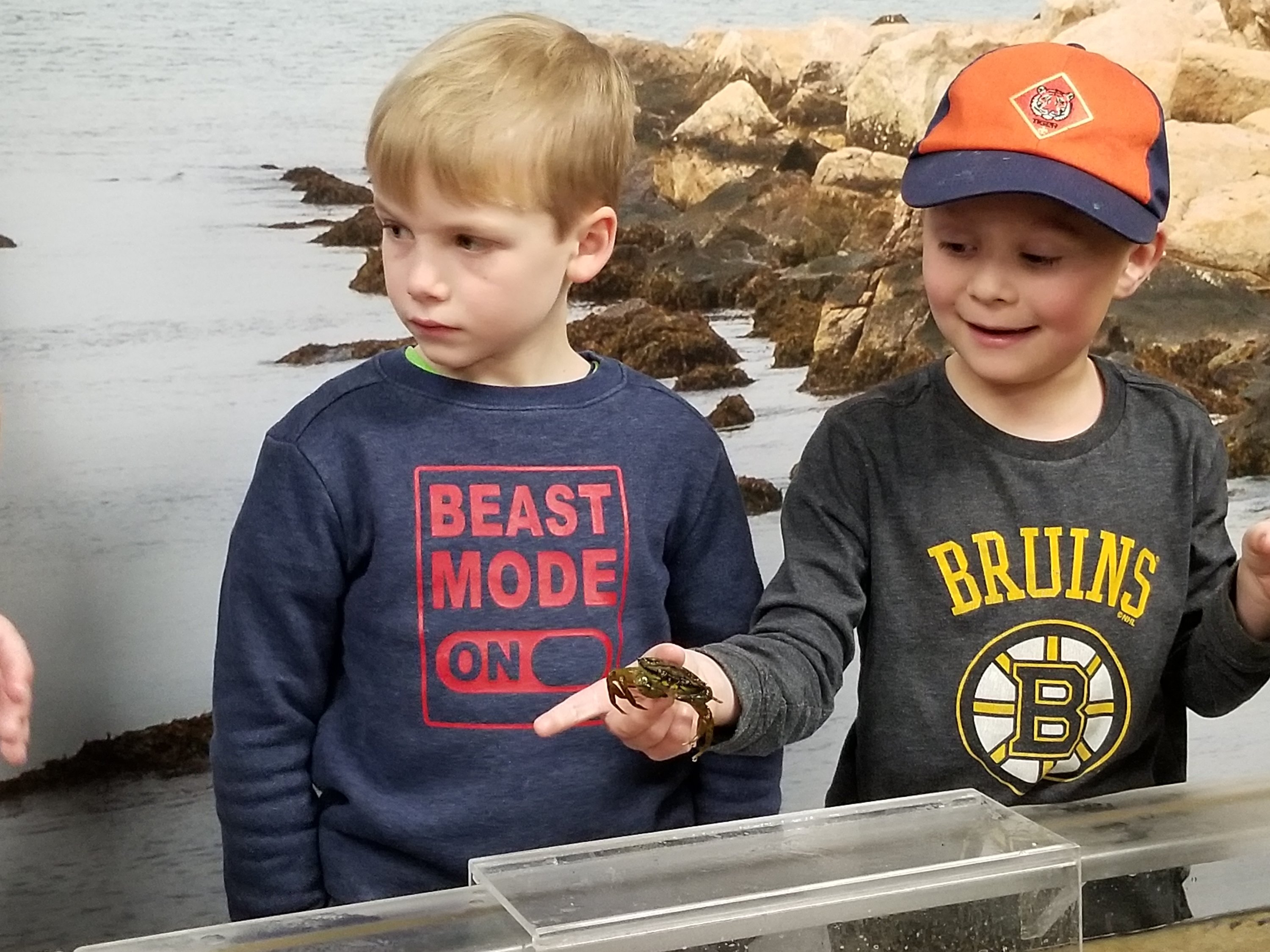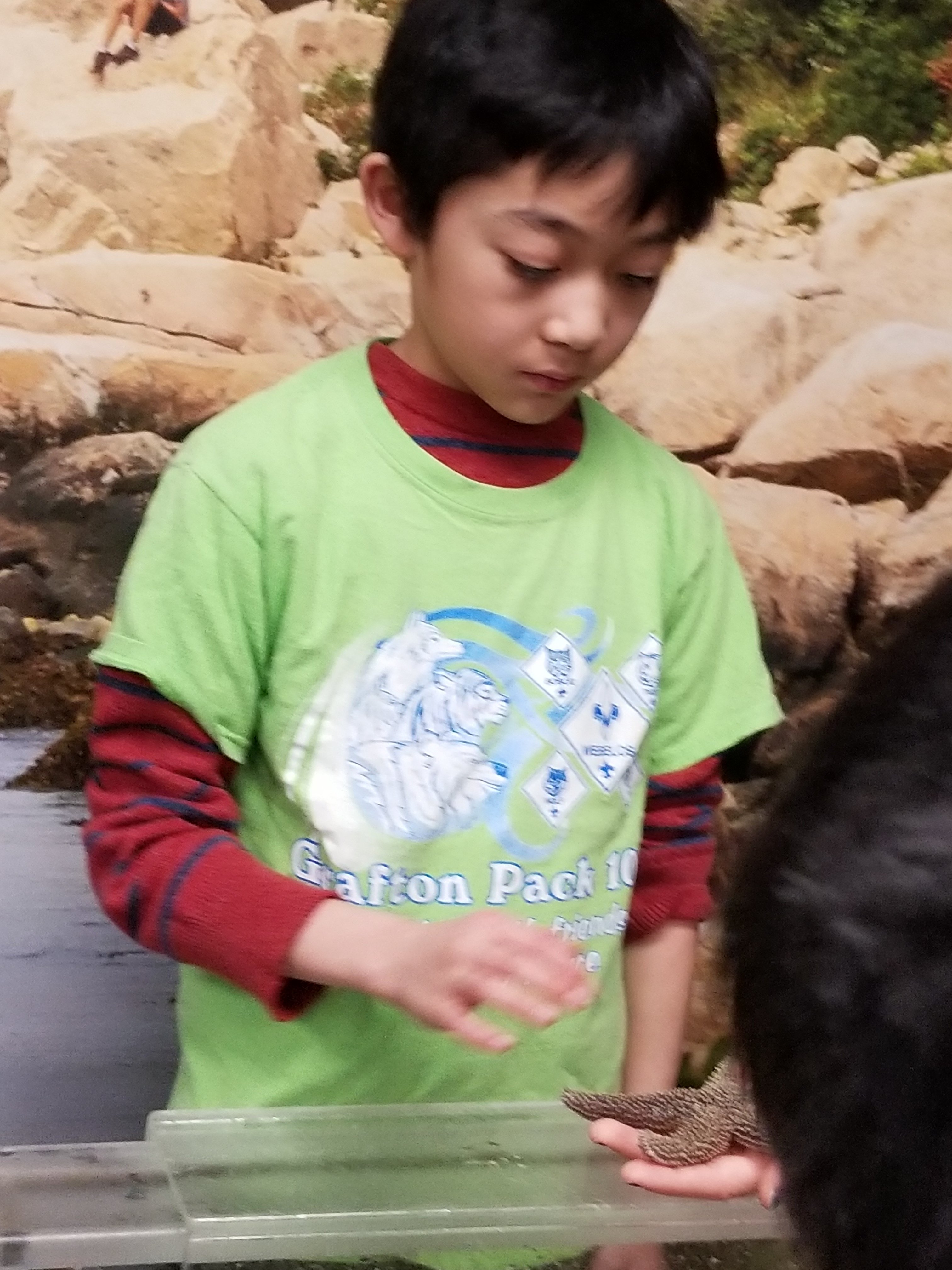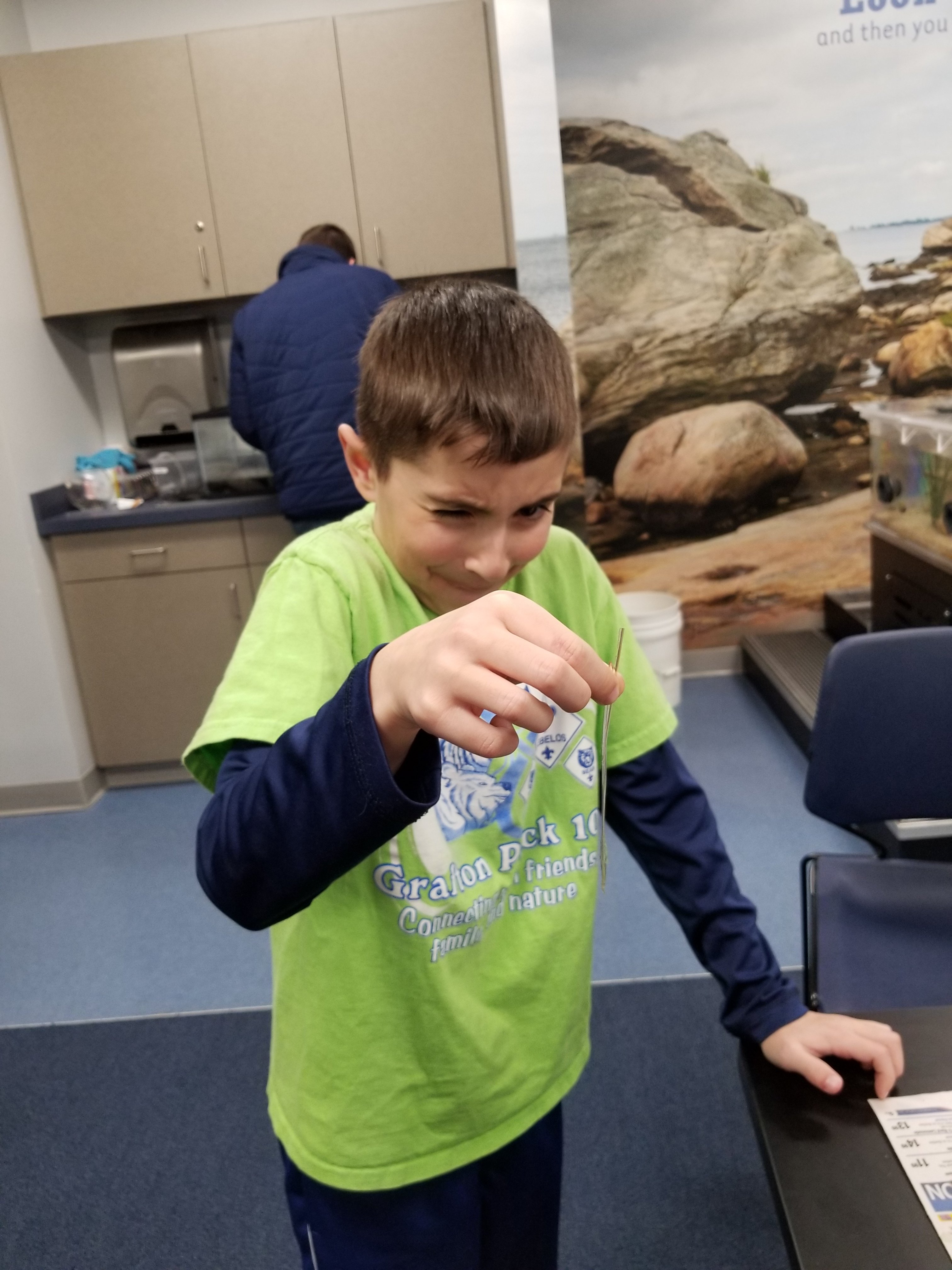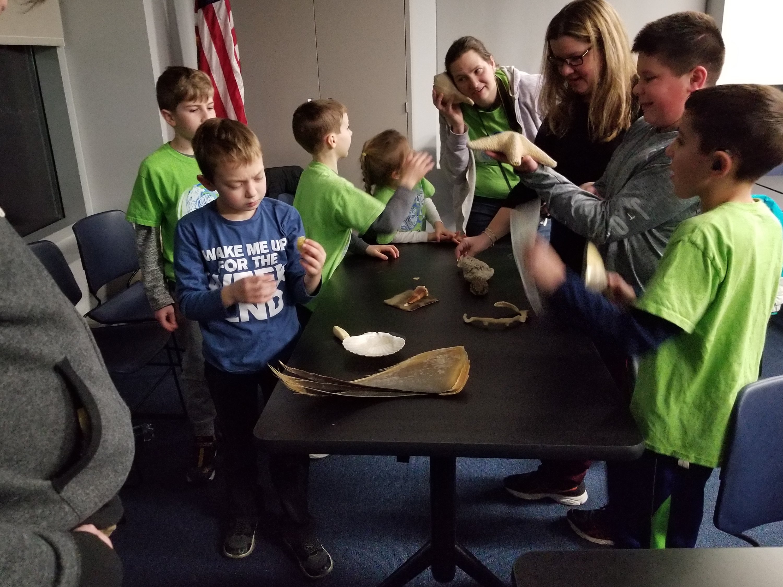 At the Invertebrates class, the cub scouts learned about the sea creatures which have different exoskeletons. They had the opportunity to touch and feel a live sea urchin, spider crab, sea star, green crabs, and horseshoe crab to name a few. They also had the opportunity to explore different exoskeletons and shells.