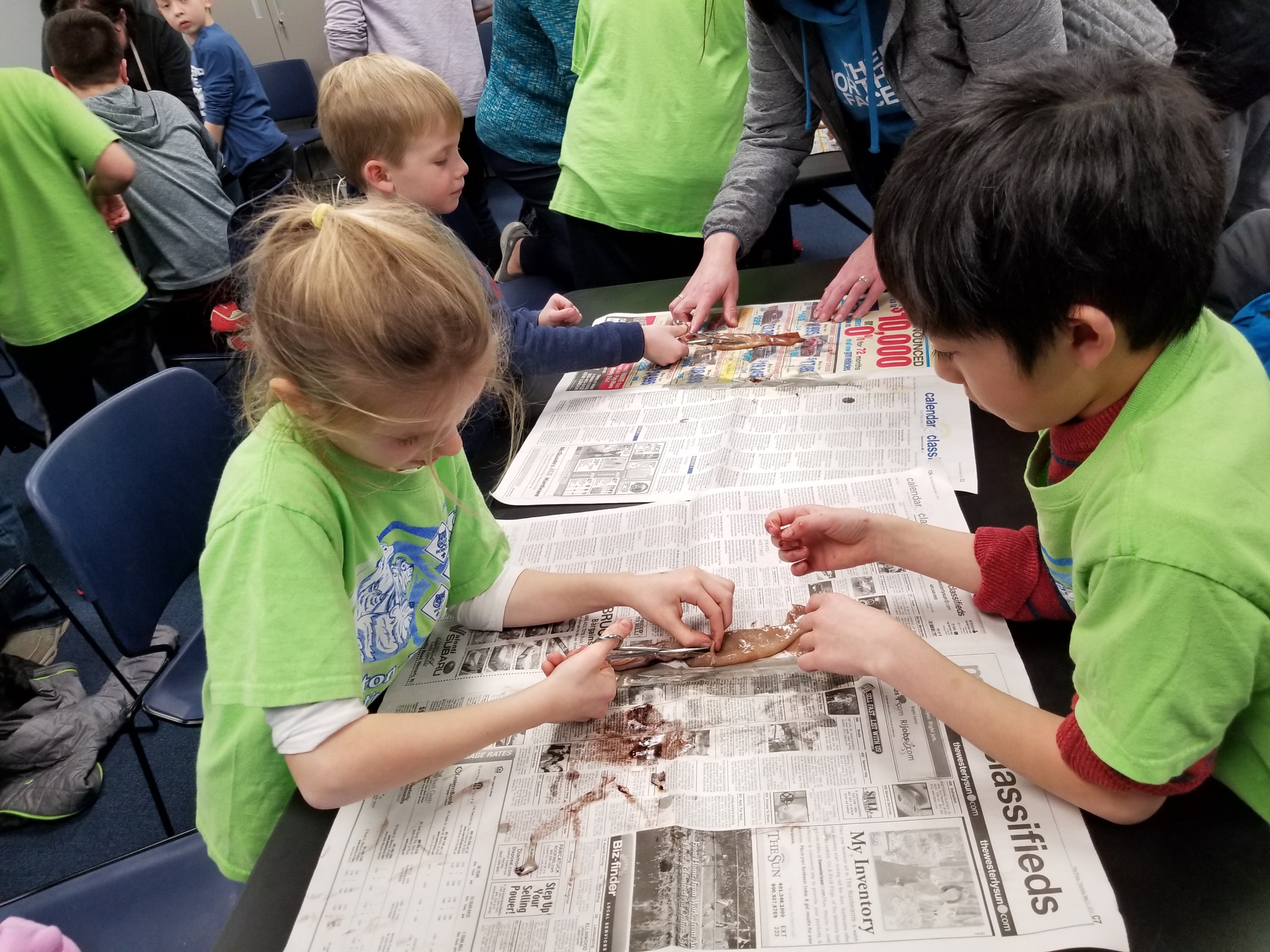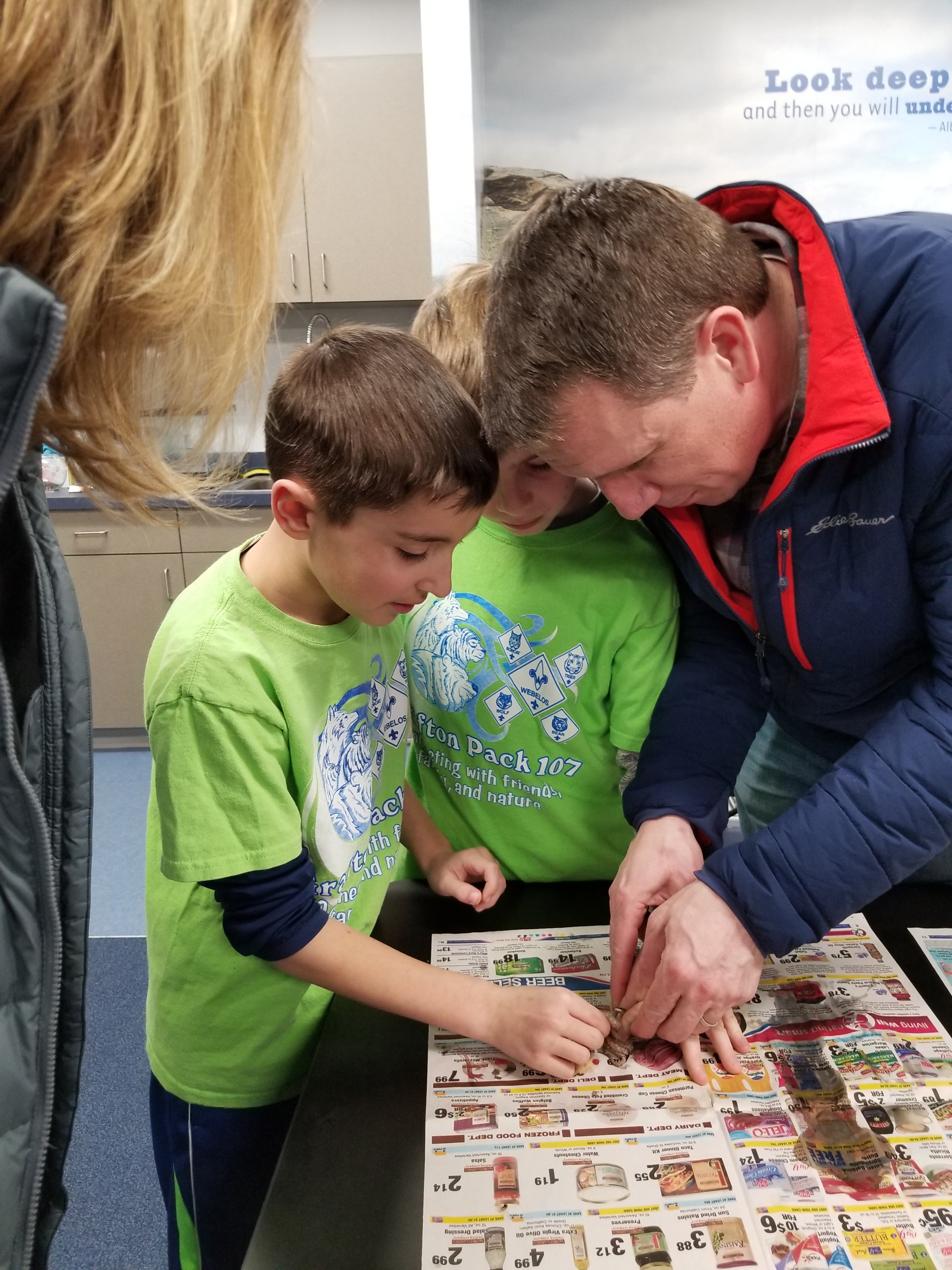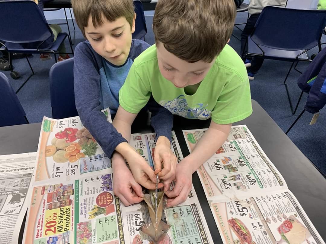 The most memorable and exciting part of the overnight experience was the class that talked about mollusks, and why a squid is considered a mollusk. Mollusks are invertebrates that have a soft body and a hard exoskeleton. The cub scouts were grouped in buddy pairs and they got to be marine biologists performing squid dissections. They learned the inner and out anatomy of the squid, which has a hard cartilage beak and a clear sliver of cartilage called the cuttle that is found inside the body of the squid. This is why a squid is classified as a mollusk.