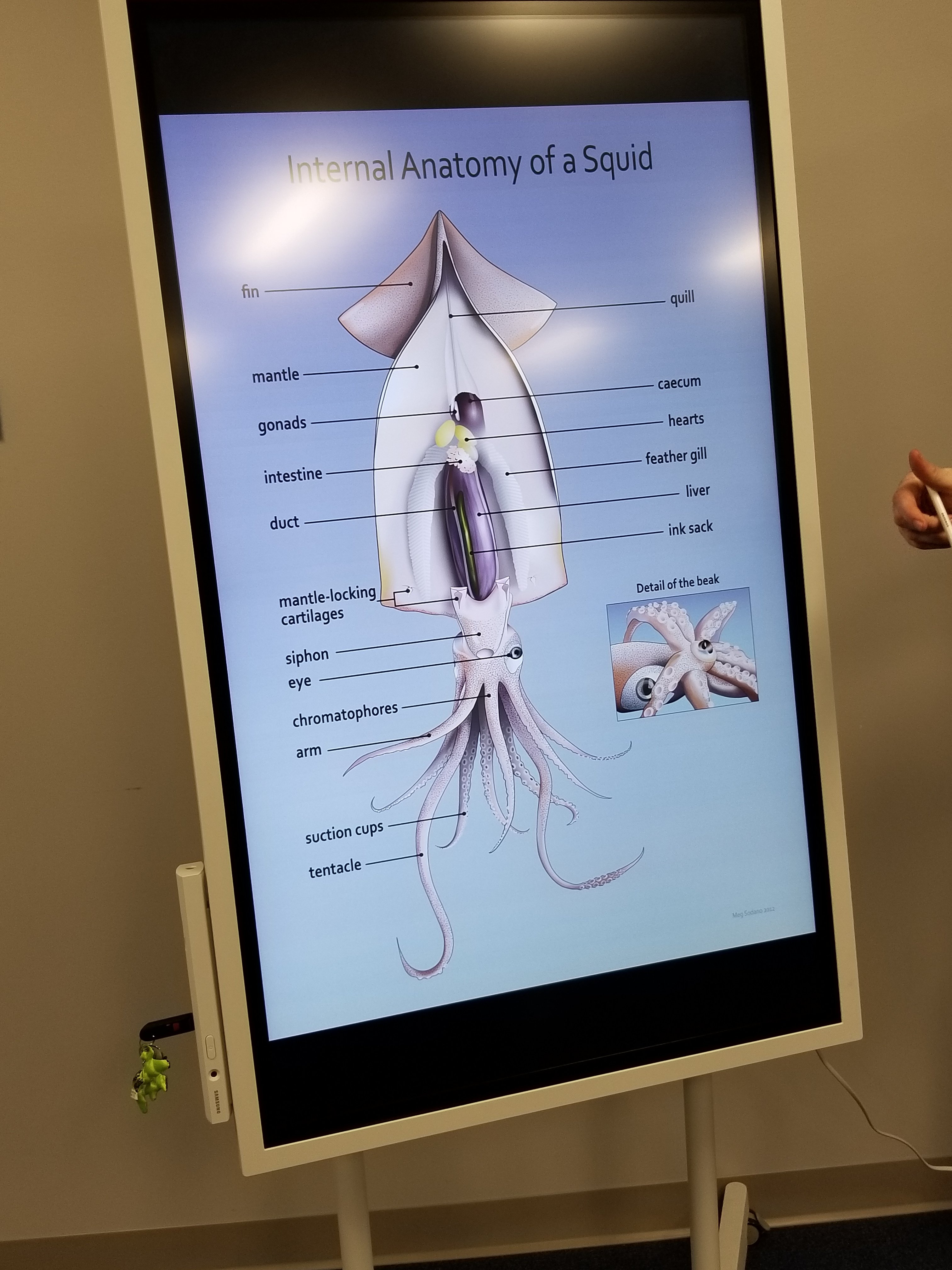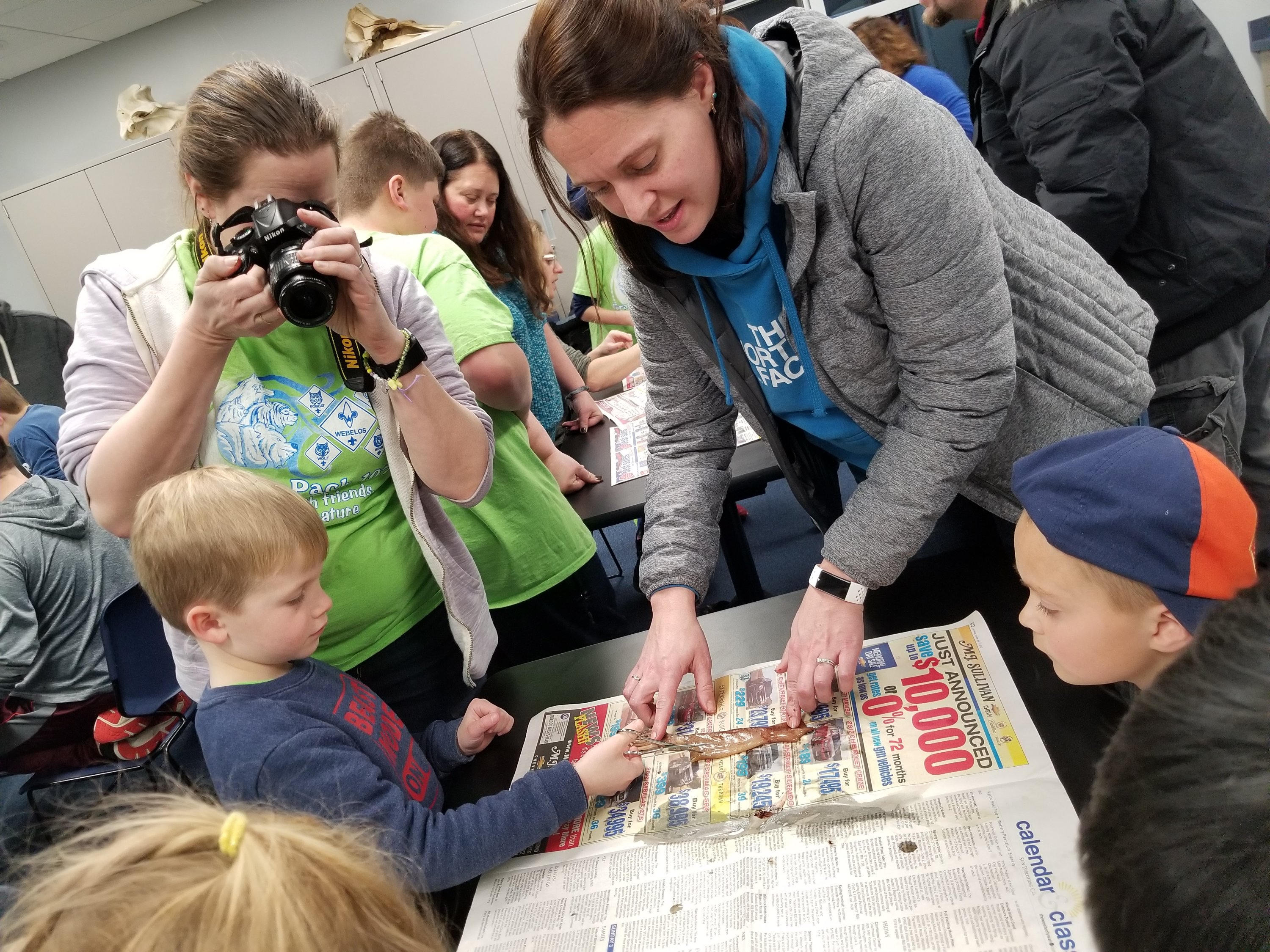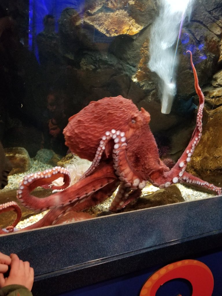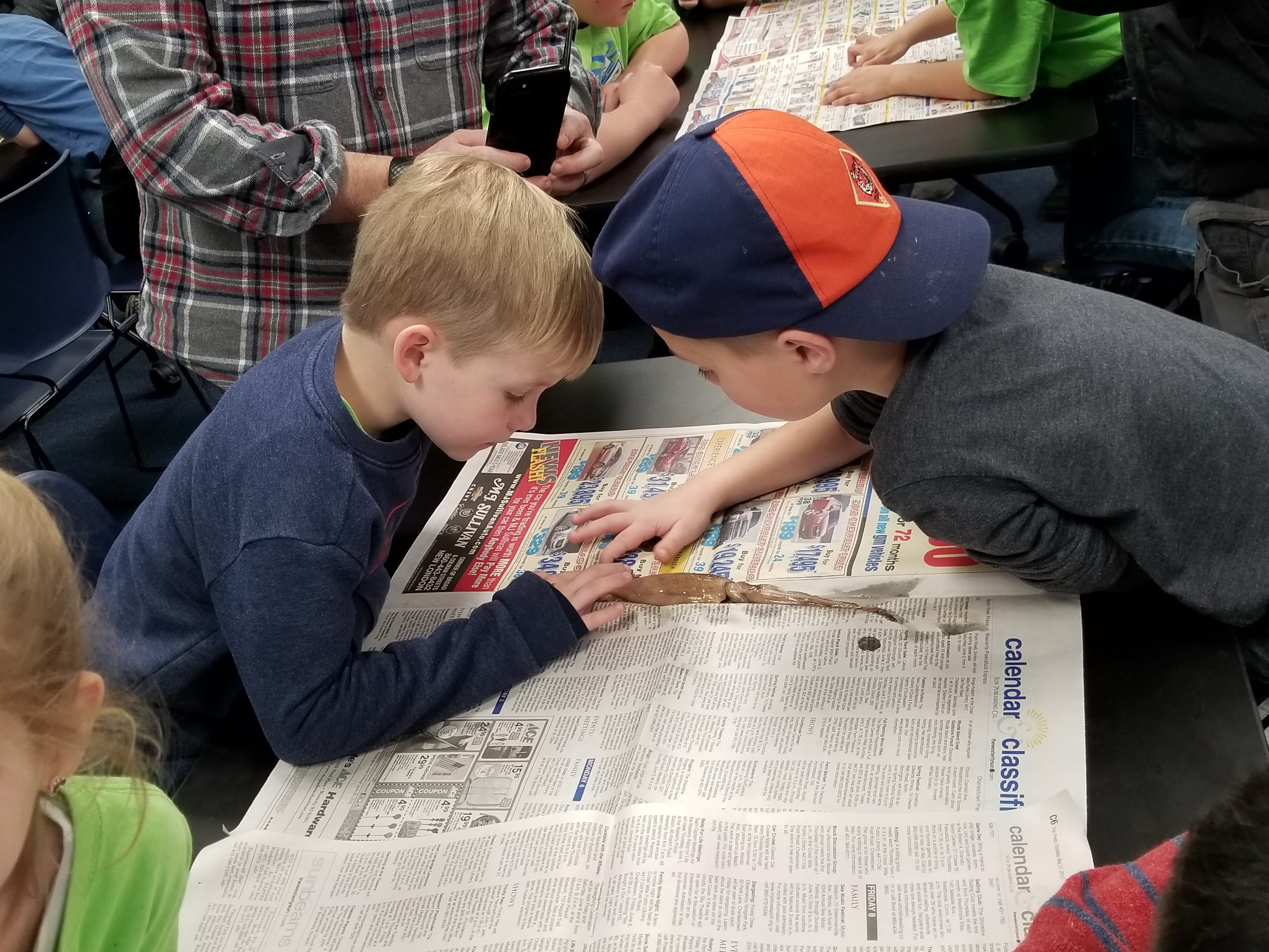 The most memorable and exciting part of the overnight experience was the class that talked about mollusks, and why a squid is considered a mollusk. Mollusks are invertebrates that have a soft body and a hard exoskeleton. The cub scouts were grouped in buddy pairs and they got to be marine biologists performing squid dissections. They learned the inner and out anatomy of the squid, which has a hard cartilage beak and a clear sliver of cartilage called the cuttle that is found inside the body of the squid. This is why a squid is classified as a mollusk.