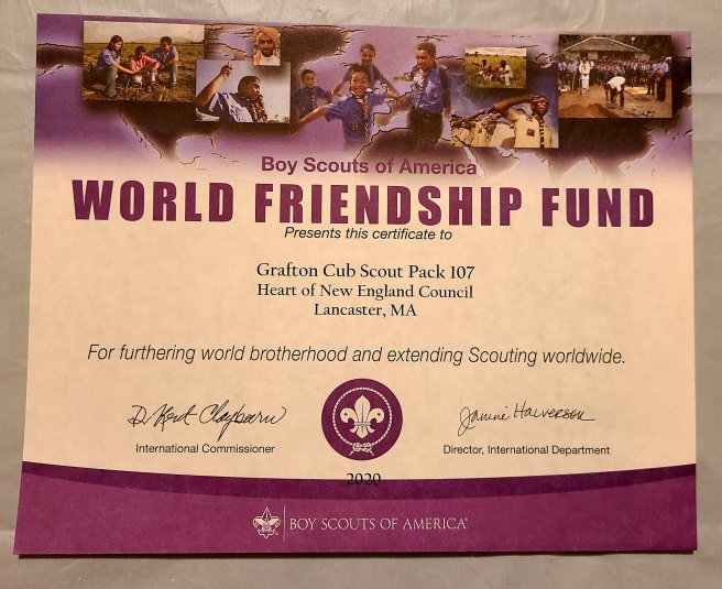 In last year Mr. Rob Lane and the AOL den had been working on fundraising for the BSA World Friendship Fund, which is an endowment fund of the BSA developed during the closing of World War II to rebuild Scouting in nations that had been wracked by war. The collection helps Scouts better understand that Scouting is global and their fellow Scouts are in need of their help. These donations have provided Scouting literature, uniforms, summer camp equipment, building camps, computers and other Scouting -related supplies to Scouts around the world. Congratulations on raising $200 toward this effort!