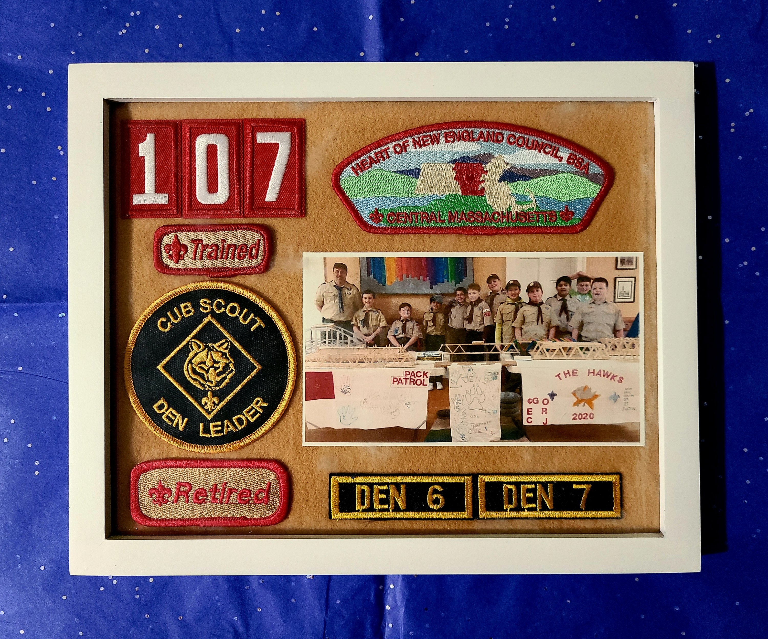 Mr. Rob Lane is the den leader of the AOL scouts, and he has been Den Leader for Dens 6 and 7 for the last 5 years. His journey in scouting did not start in childhood but as a partner and support for his older son, Steven, when he decided to try out cub scouts. There was a need for new den leaders, and Mr. Lane stepped up to the challenge. He learned together with Steven about Cub Scouting, and was able to help shape his son’s experience while at it. Mr. Lane’s talent and knowledge of camping, the outdoors, and being handy with tools were a real asset to him being a Cub Scout Den Leader. Beyond these skills, he is also a leader who really cares about each scout’s growth and journey in scouting, and has taken on the task on leading the largest den in Pack 107. He has also been a Co-Popcorn Kernel along with his wife, April, for the last 5 years. Pack 107 has been greatly blessed to have Mr. Lane be one of the Den Leaders and Committee members. We are truly grateful for all your contributions to the pack, and for sharing your time and talents with the scouts in your dens. The AOLs gifted Mr. Lane a beautiful framed collection of Cub Scout patches and to celebrate his big “retirement” as Den Leader.