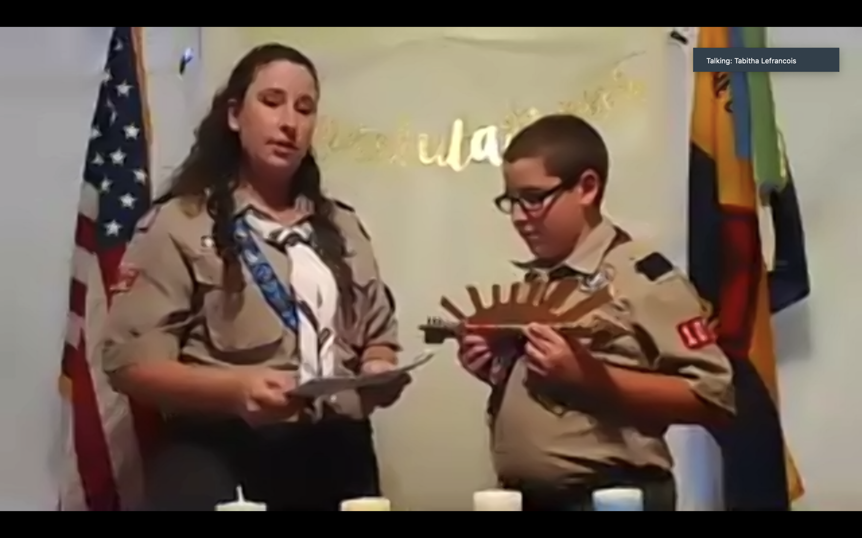 Our Cubmaster, Tabitha Lefrancois, was the Master of Ceremonies, and was aided by her son, Kaleb, who is one of AOLs to graduate and cross over to BSA Scouts. Tabitha started with the lighting of 4 colored candles.