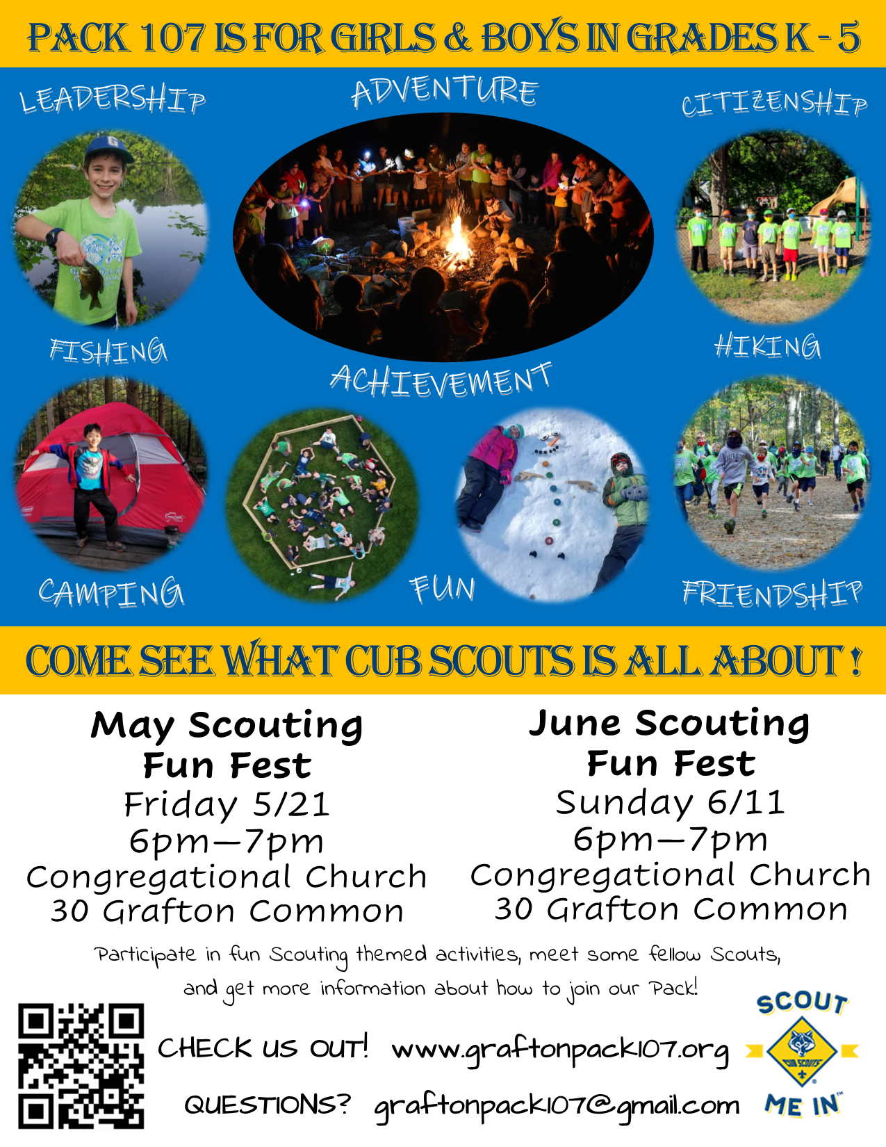 Do you have a daughter or son who will be entering grades K-5 in the fall? Do they like adventure and outdoor fun, doing STEM activities, and doing fun activities with the family? Do they like making new friends or are they a little timid? Cub Scouting is a great way to get your child back out to learn and see nature, explore hidden talents, learn what it means to be a responsible citizen, while making meaningful, lasting friendships! As a family scouting program Cub Scout Pack 107 is for both girls and boys, so all siblings in the grades K-5 can join together. The pack will guide you and teach you how to go hiking, camping and so much more! The Scouting program helps build a foundation for our youth to become tomorrow’s leaders!