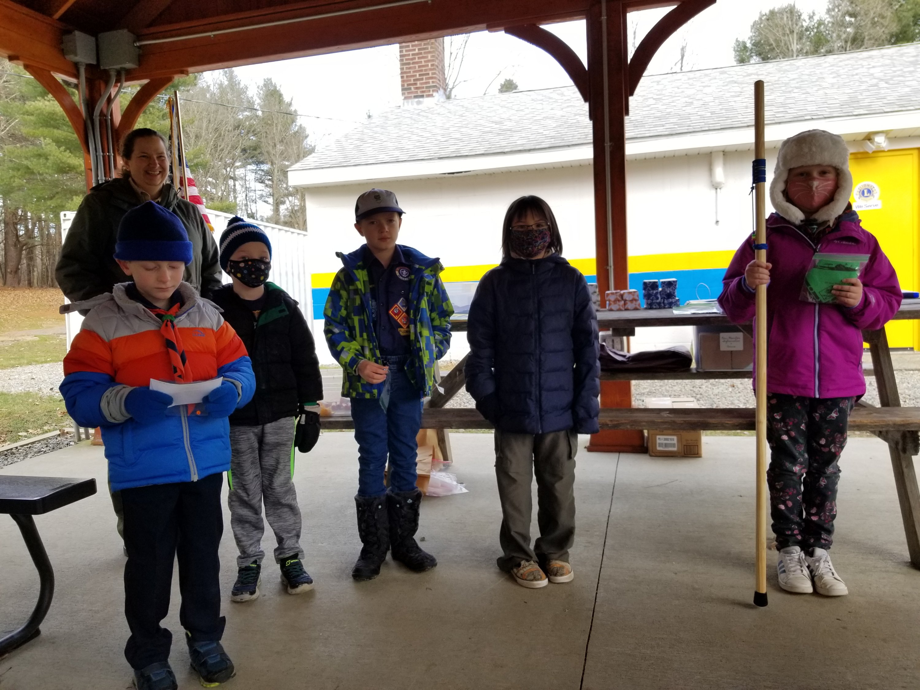 On Saturday, 12/3/2021, Pack 107 held their December Holiday Pack Meeting at the Grafton Lions Club. The Bear and Tiger Dens did a wonderful job opening the meeting performing the Color Guard ceremony. We welcomed our new Lion, Lucas M to the Pack! Hiking miles were awarded to Tennyson, Ollie D, Jazzy, Lukas, Jacob, and Ailsa who earned enough miles for a hiking stick!