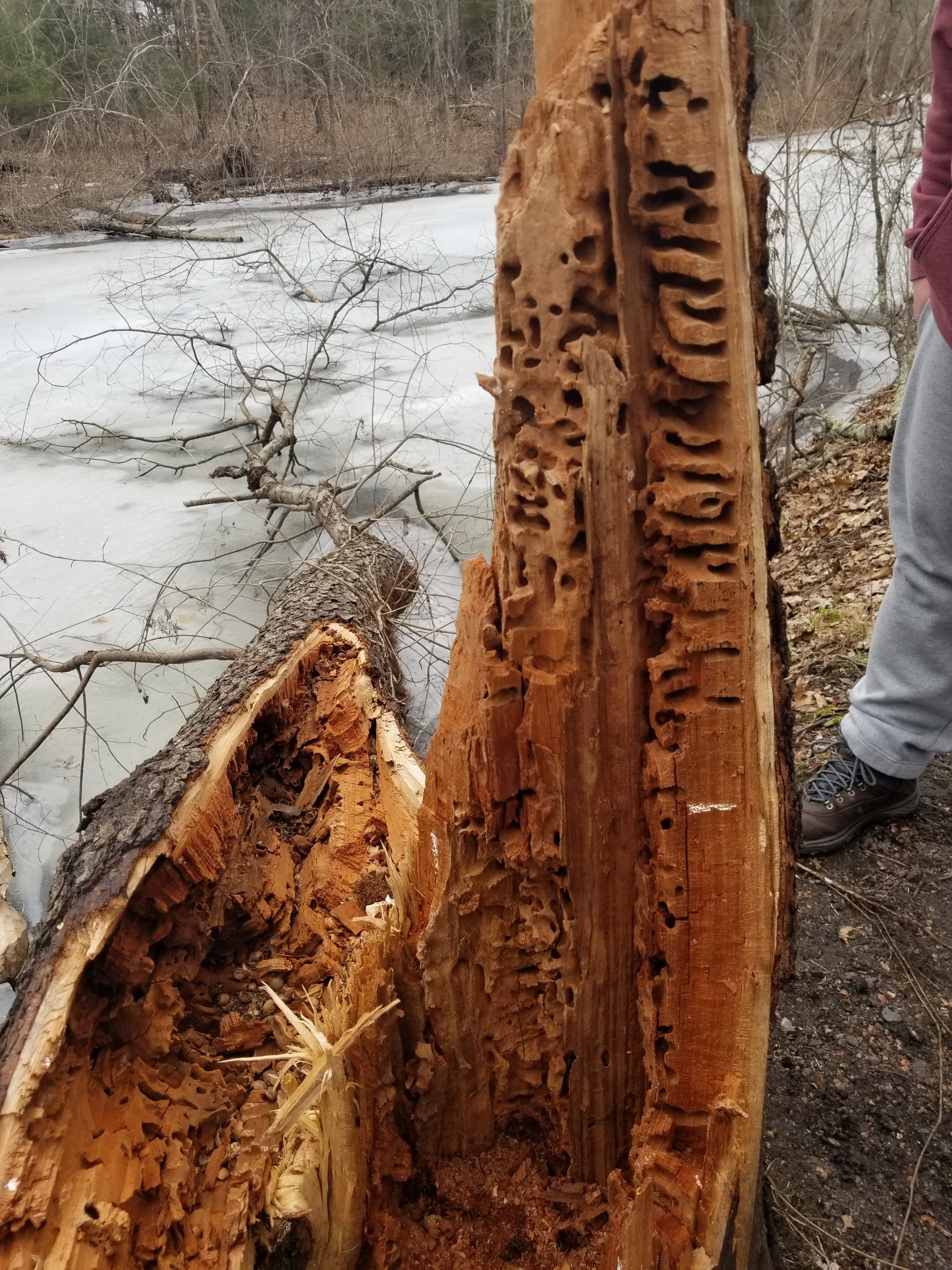 Some Scouts spotted signs of animals in nature, such as a beaver chewed tree trunk, carpenter ants tunnels in a fallen tree trunk, and woodpecker holes. At the location of our snack break, Scouts were doing forensic investigation on how a picnic bench was damaged by a fallen tree trunk, by some windy storm, with the tree trunk already weakened by carpenter ant damage and woodpecker damage.