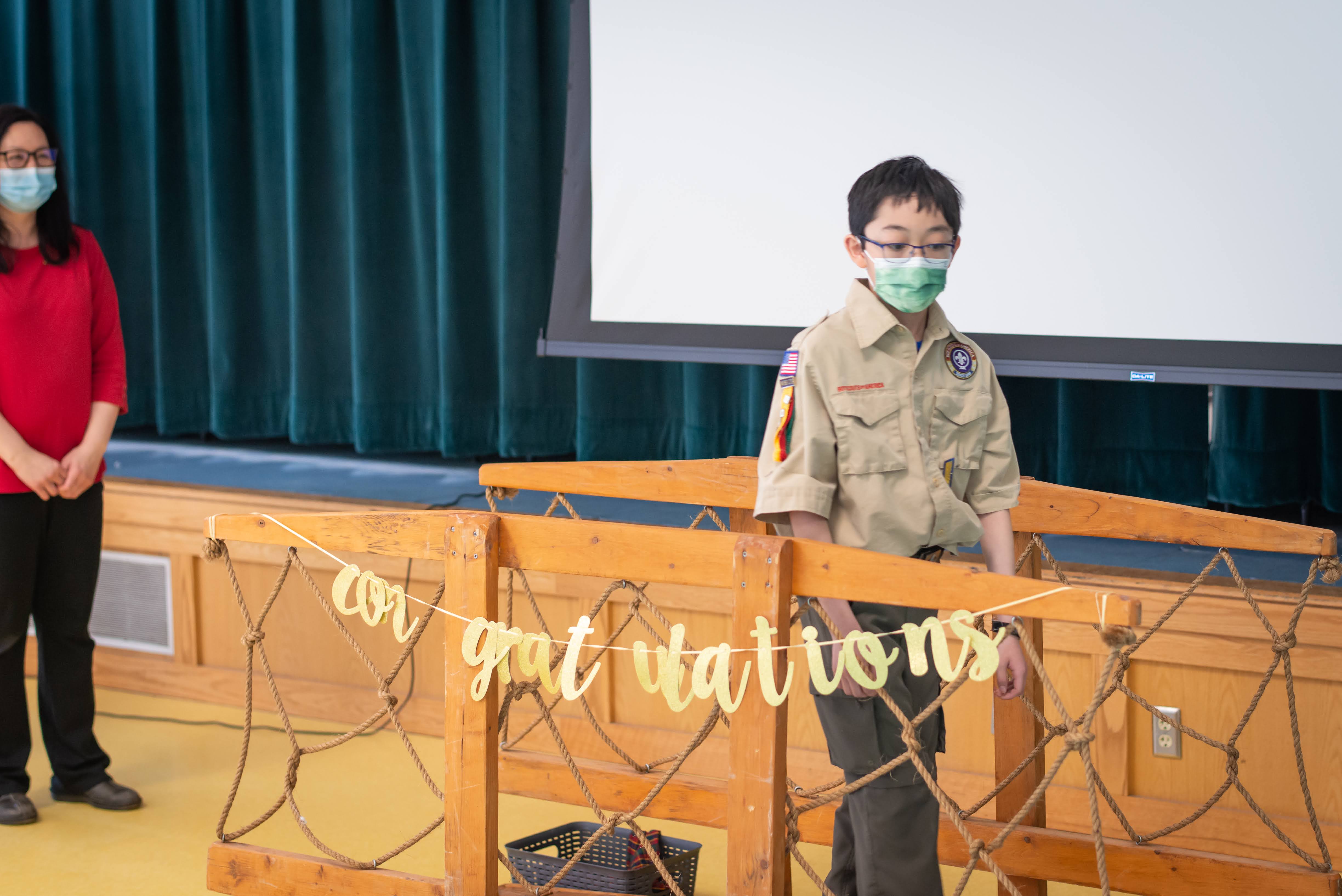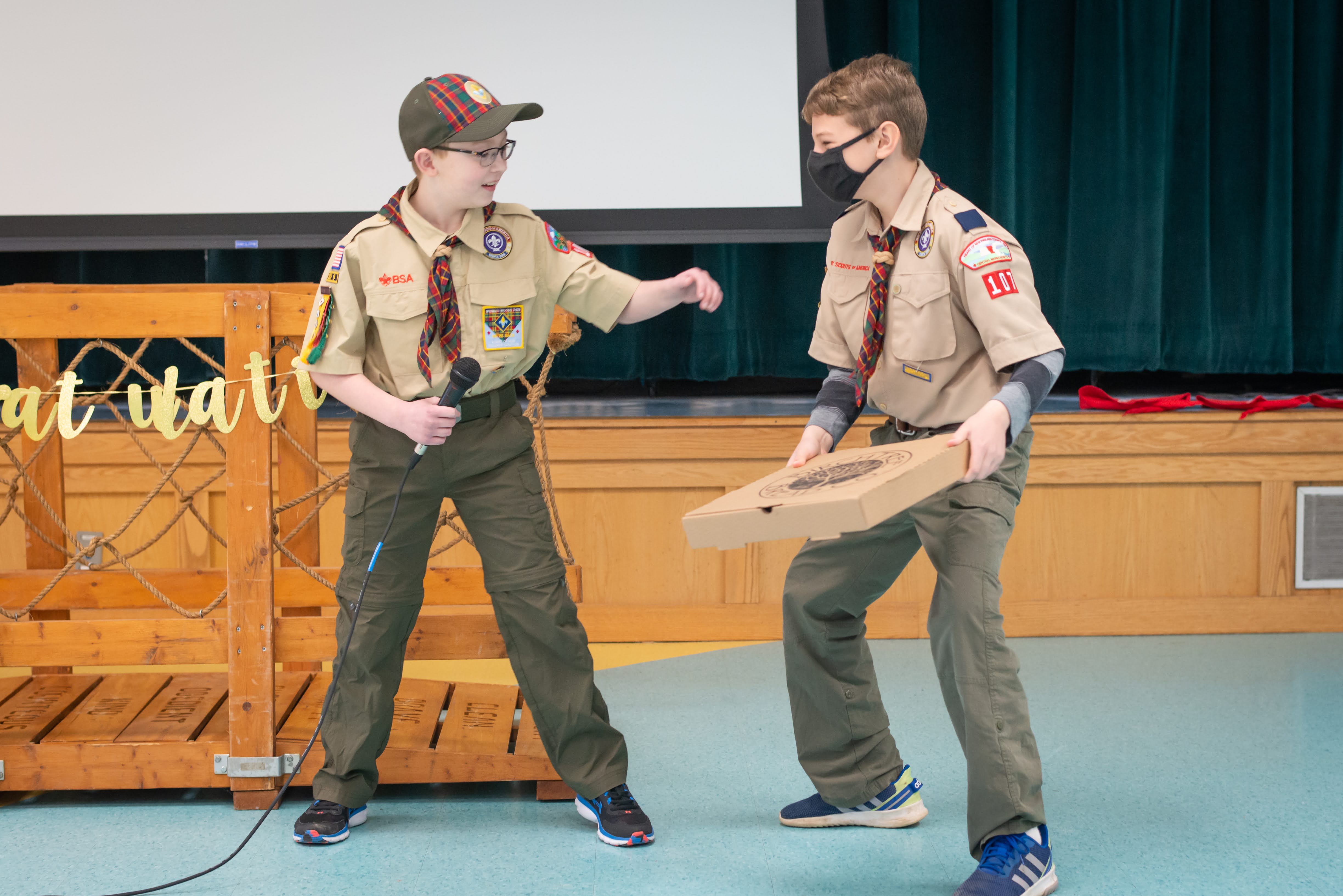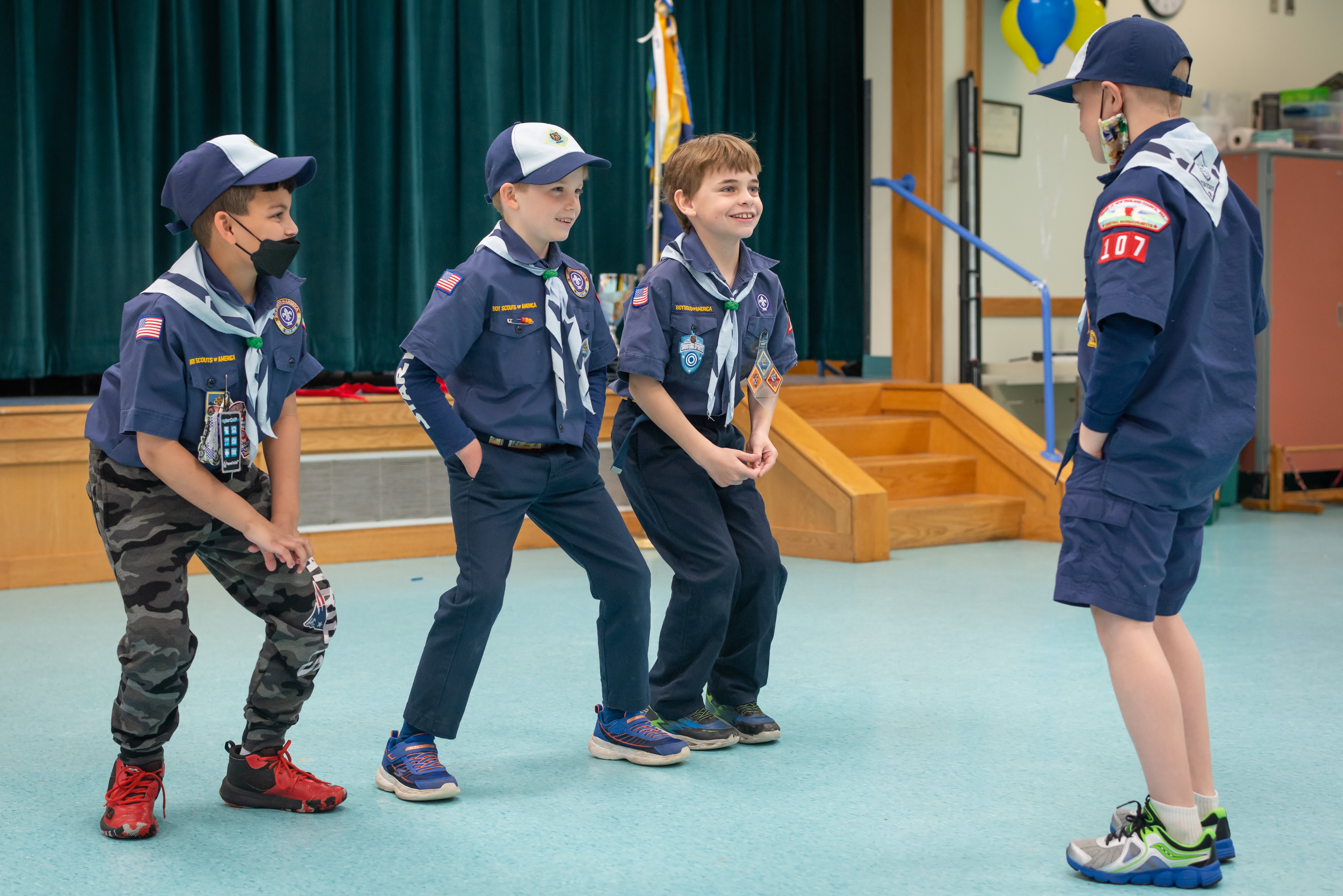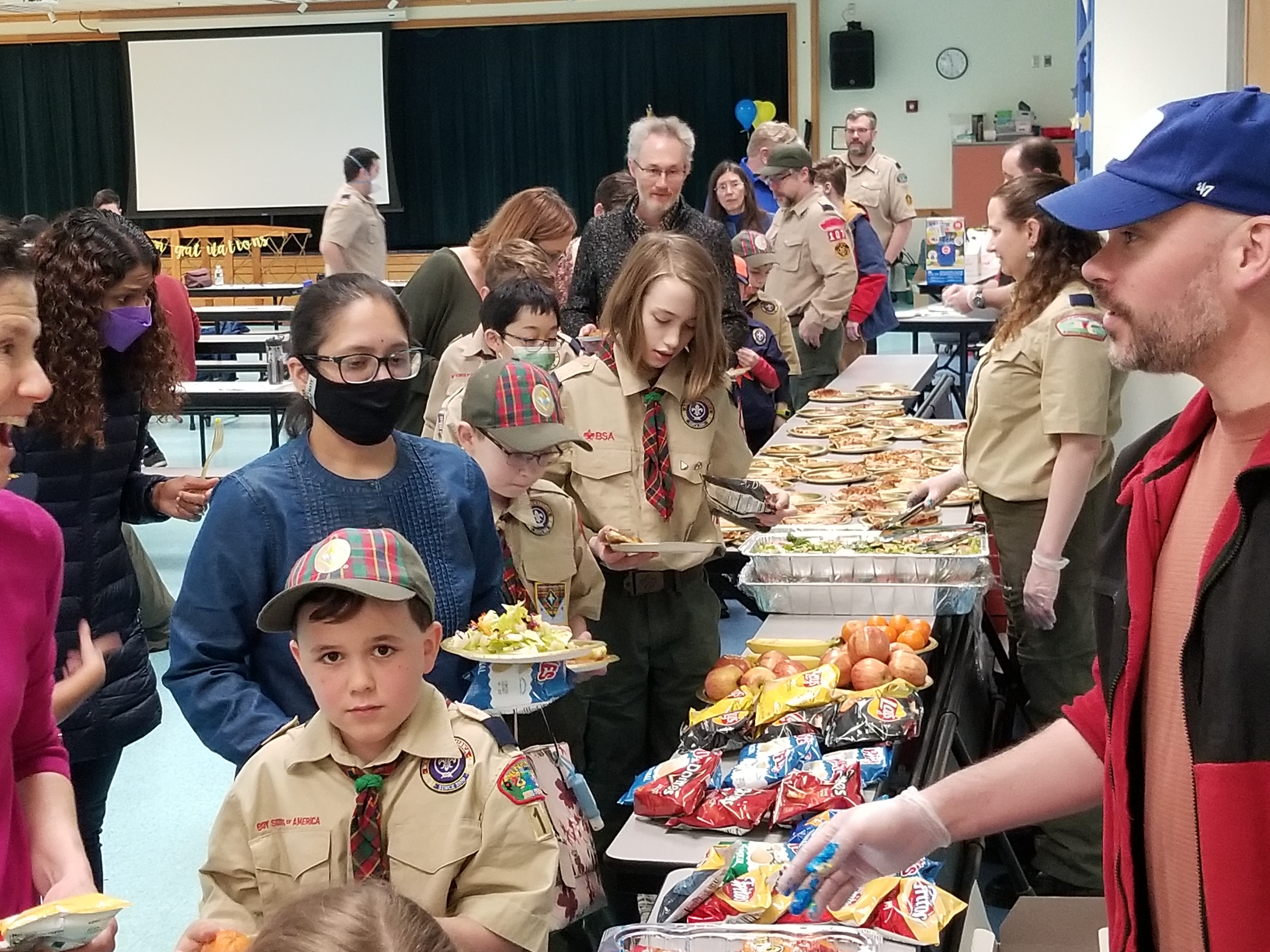 On Saturday 4/9/2022, Cub Scout Pack 107 hosted it’s Blue and Gold Banquet at Millbury Street Elementary School in Grafton. The Blue and Gold Banquet is one of the most exciting and important celebrations in the Scouting calendar, as Scouts celebrate the birthday and the anniversary of the founding of the Boy Scouts of America Program on February 8th,1910. This year’s Blue and Gold Banquet is extra-special since it is the first time we were able to celebrate in person since 2019. The outbreak of the COVID-19 pandemic forced us to commemorate this occasion remotely for 2 years in a row. At the Blue and Gold Banquet, our Pack also celebrates the Arrow of Light Scouts as they receive their rank of Arrow of Lights, which is the highest rank to be earned in the Cub Scouting Program. We also gather to celebrate their cross over to the Troop level as BSA Scouts, and wishing them farewell from our Pack. In addition special recognitions and achievements are awarded.