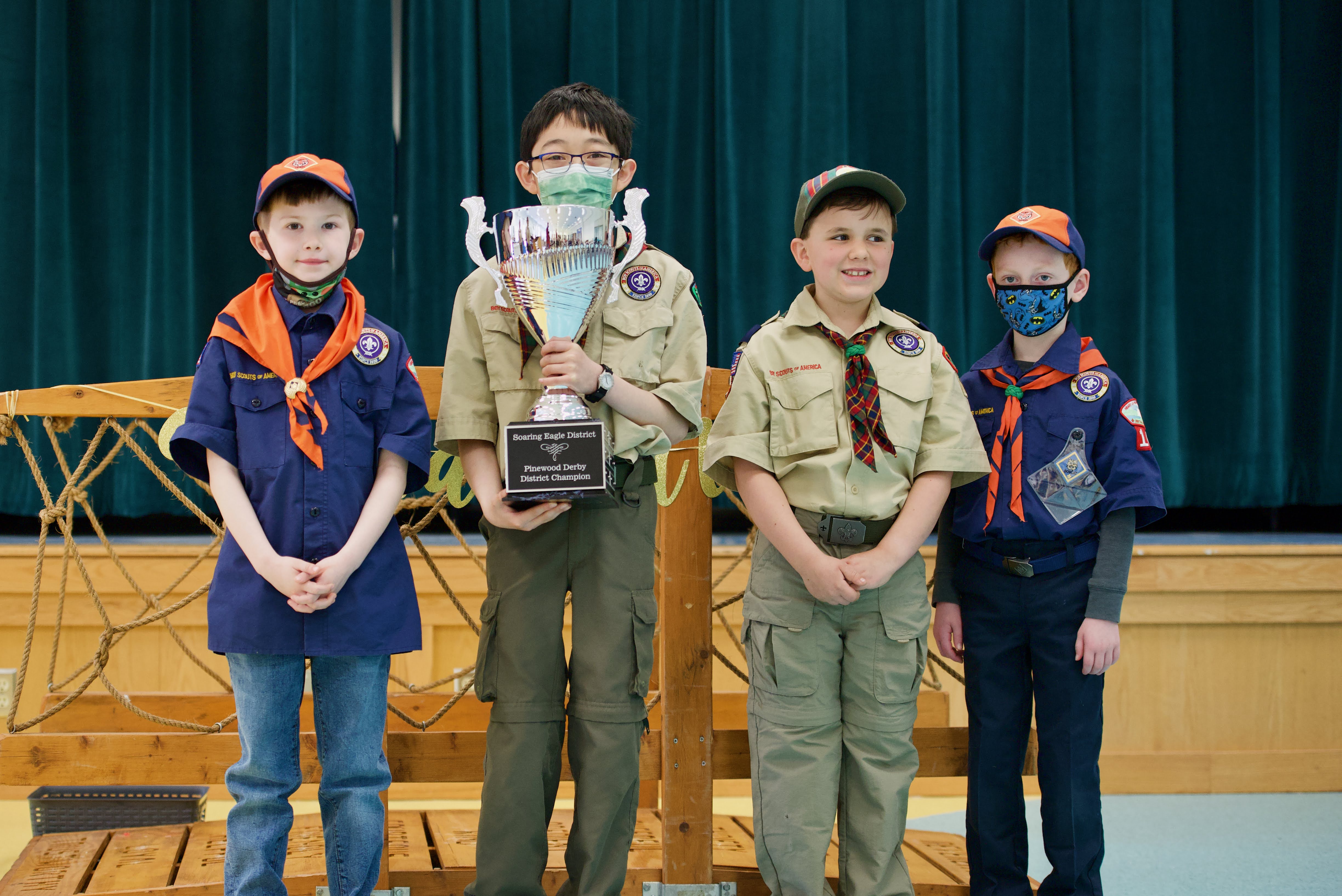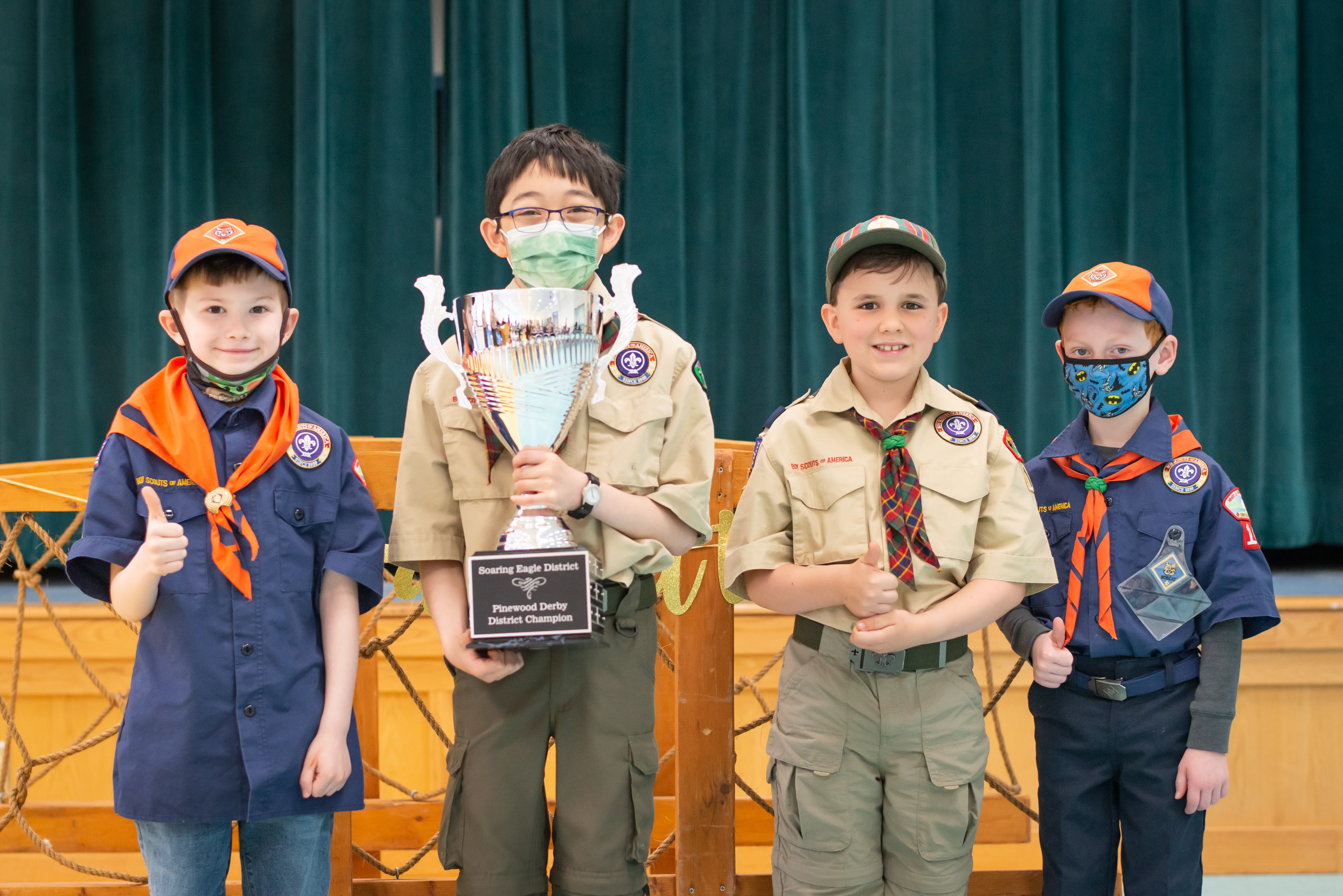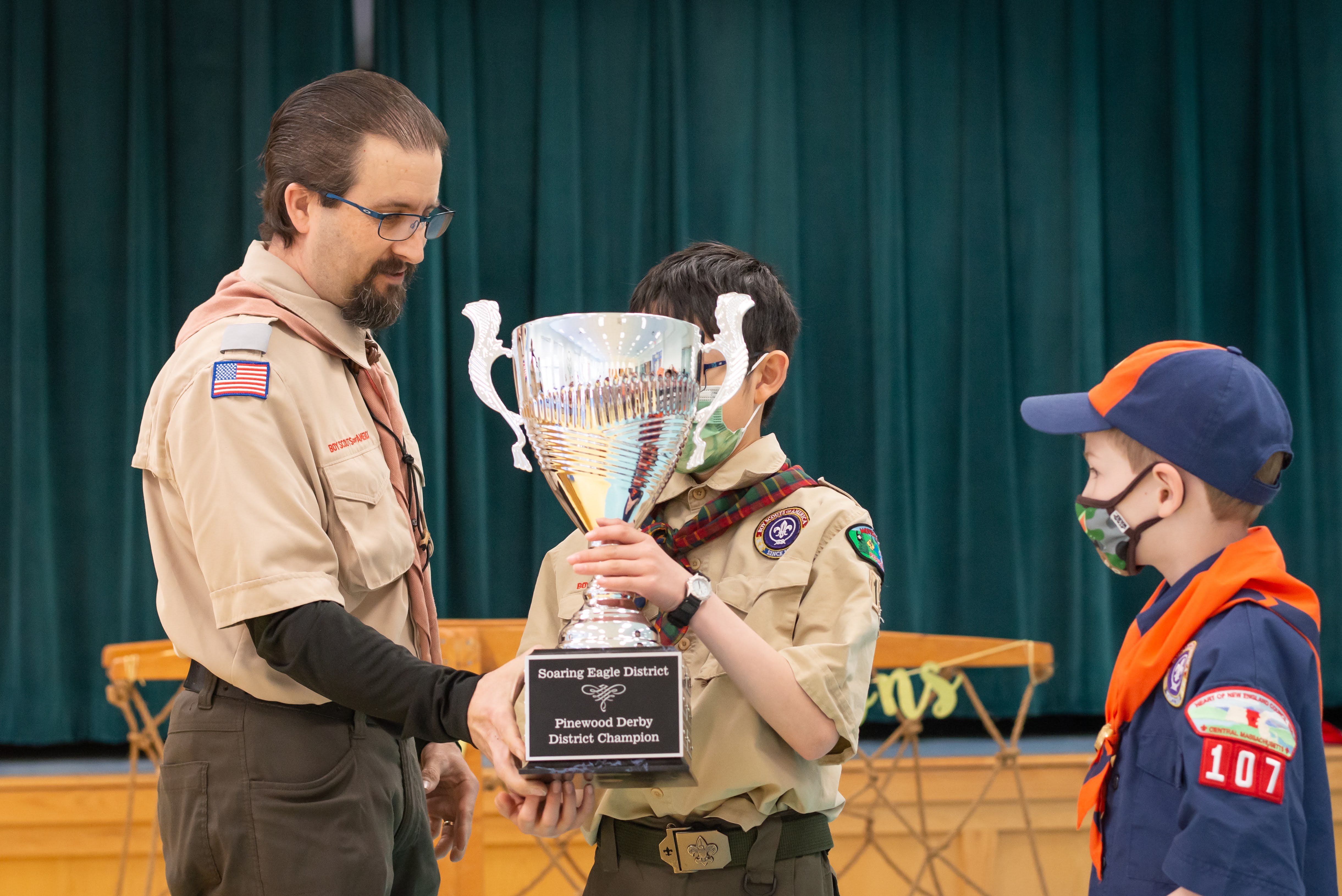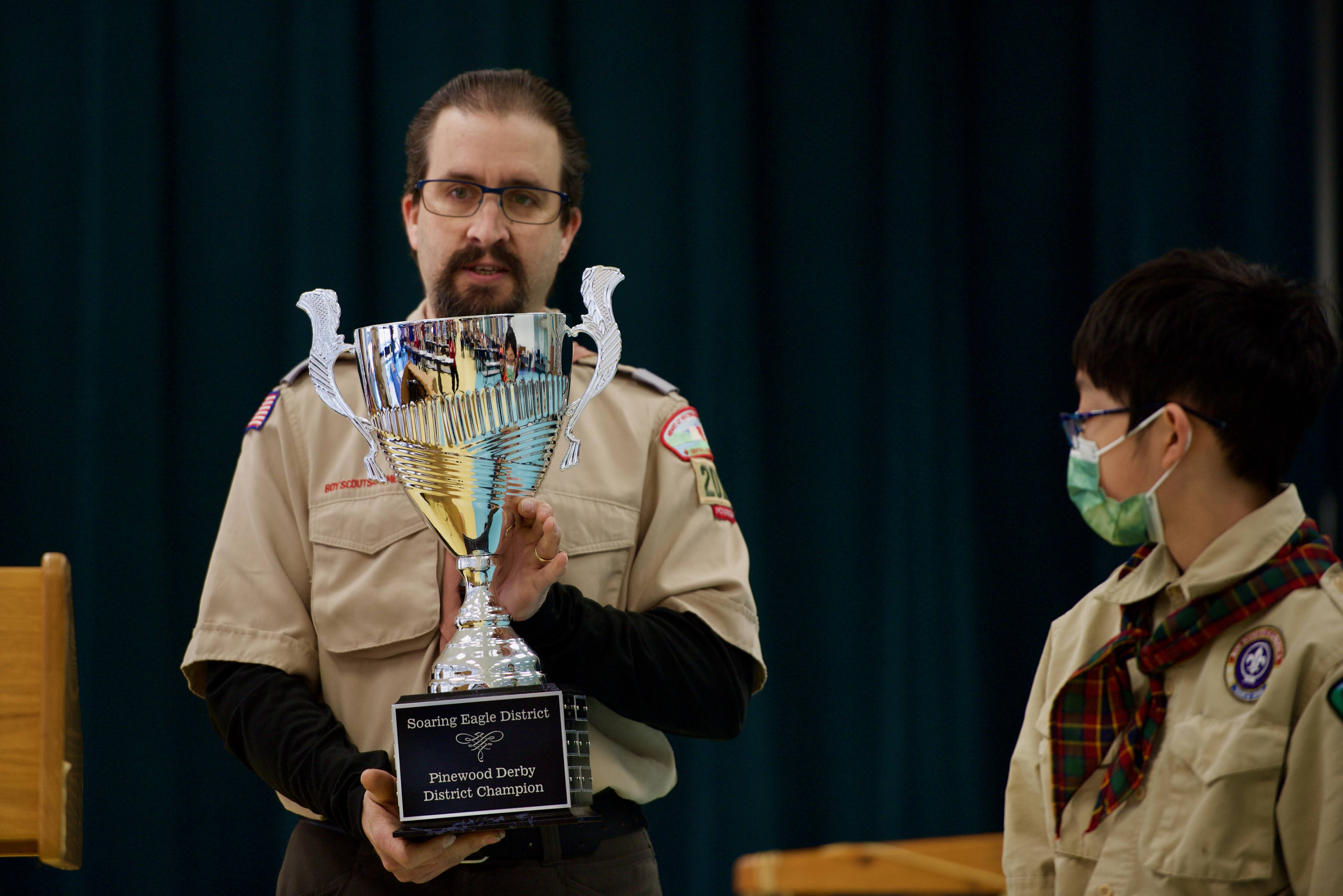 Mr. Erik Coldwell, Assistant Scoutmaster or Troop 107, and Souring Eagle Distict Pinewood Derby Championship organizer presented Pack 107 as the first winner of Championship Tophy. He also mentioned all the winners from Pack 107 who won at the District Derby.