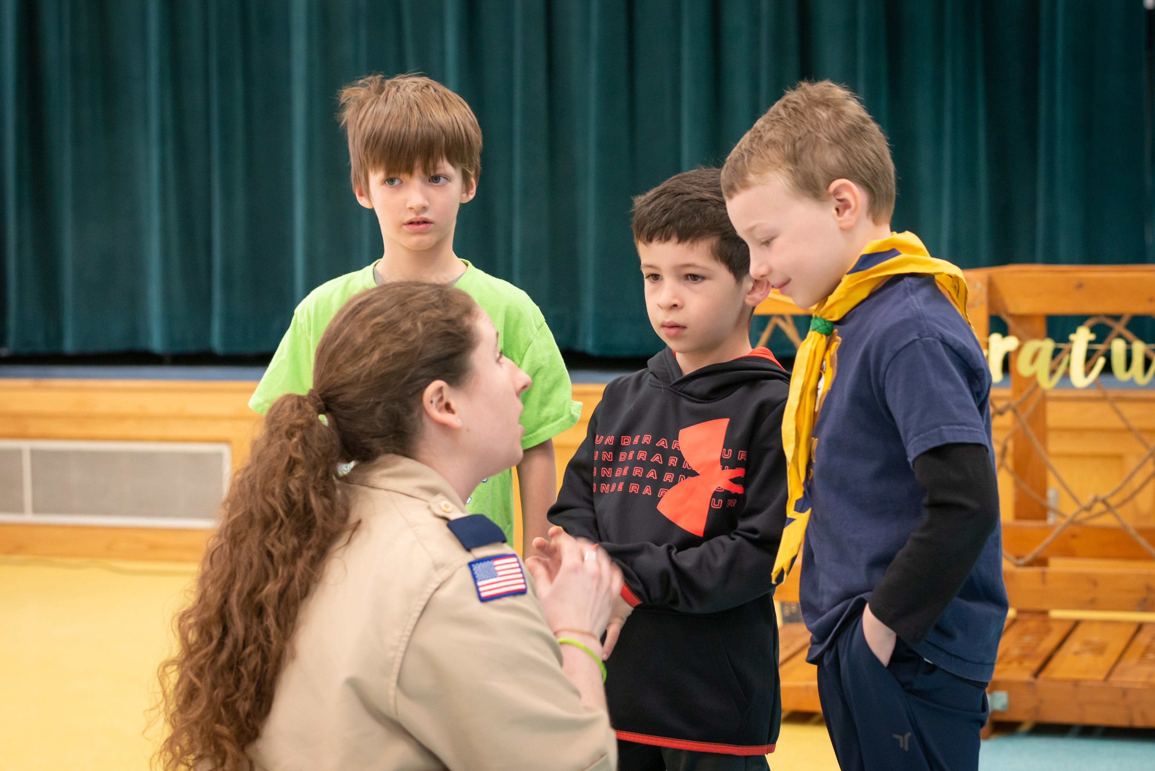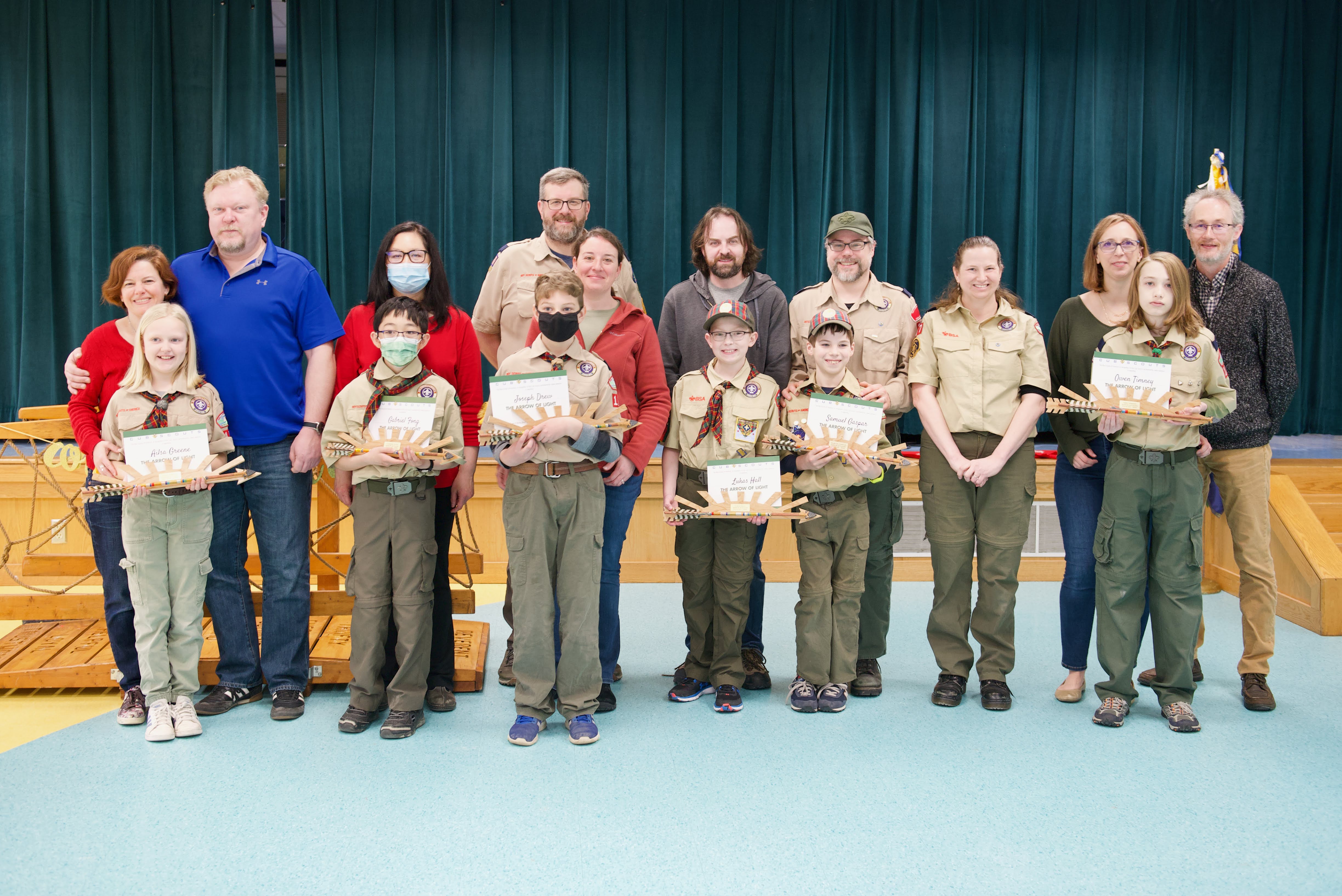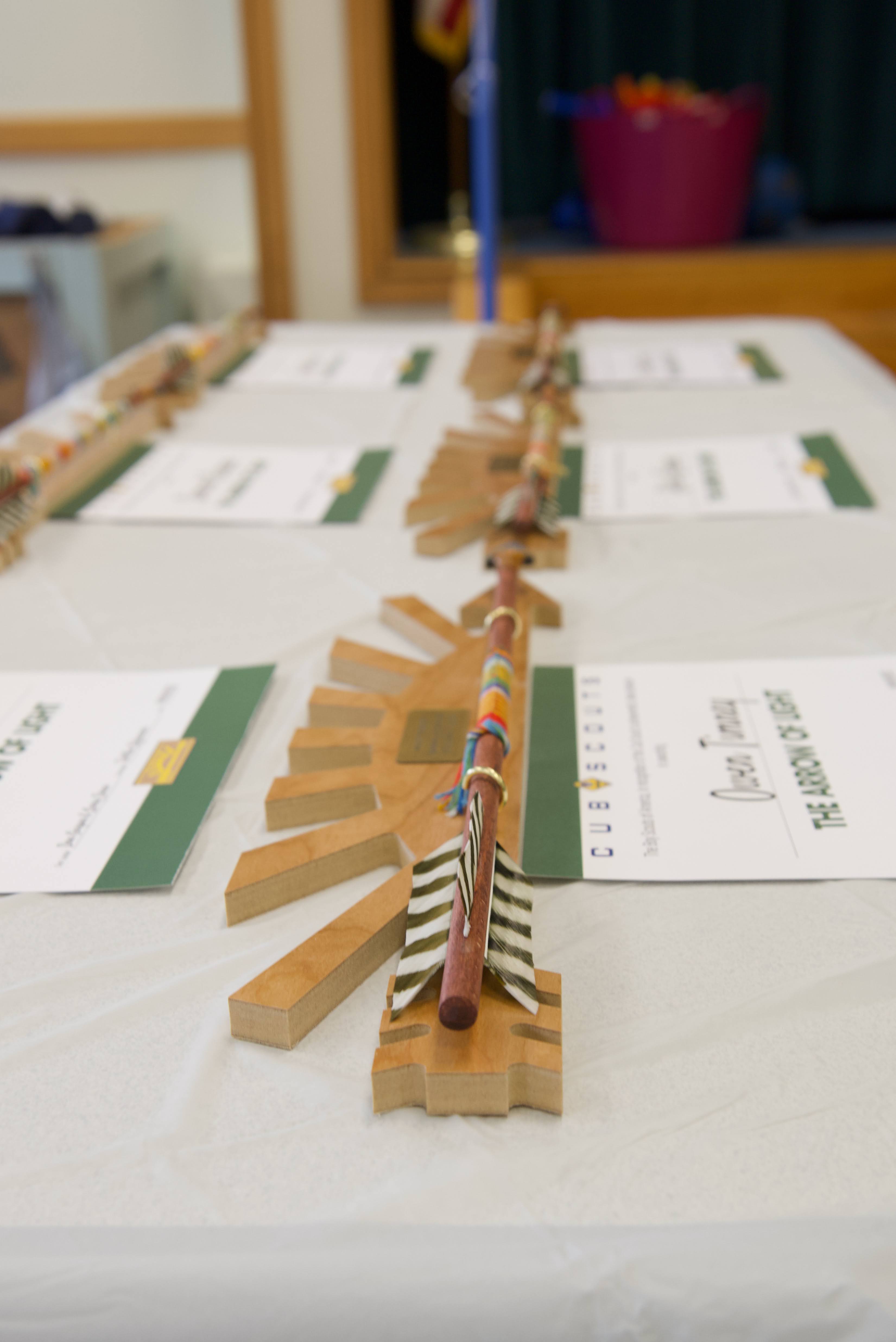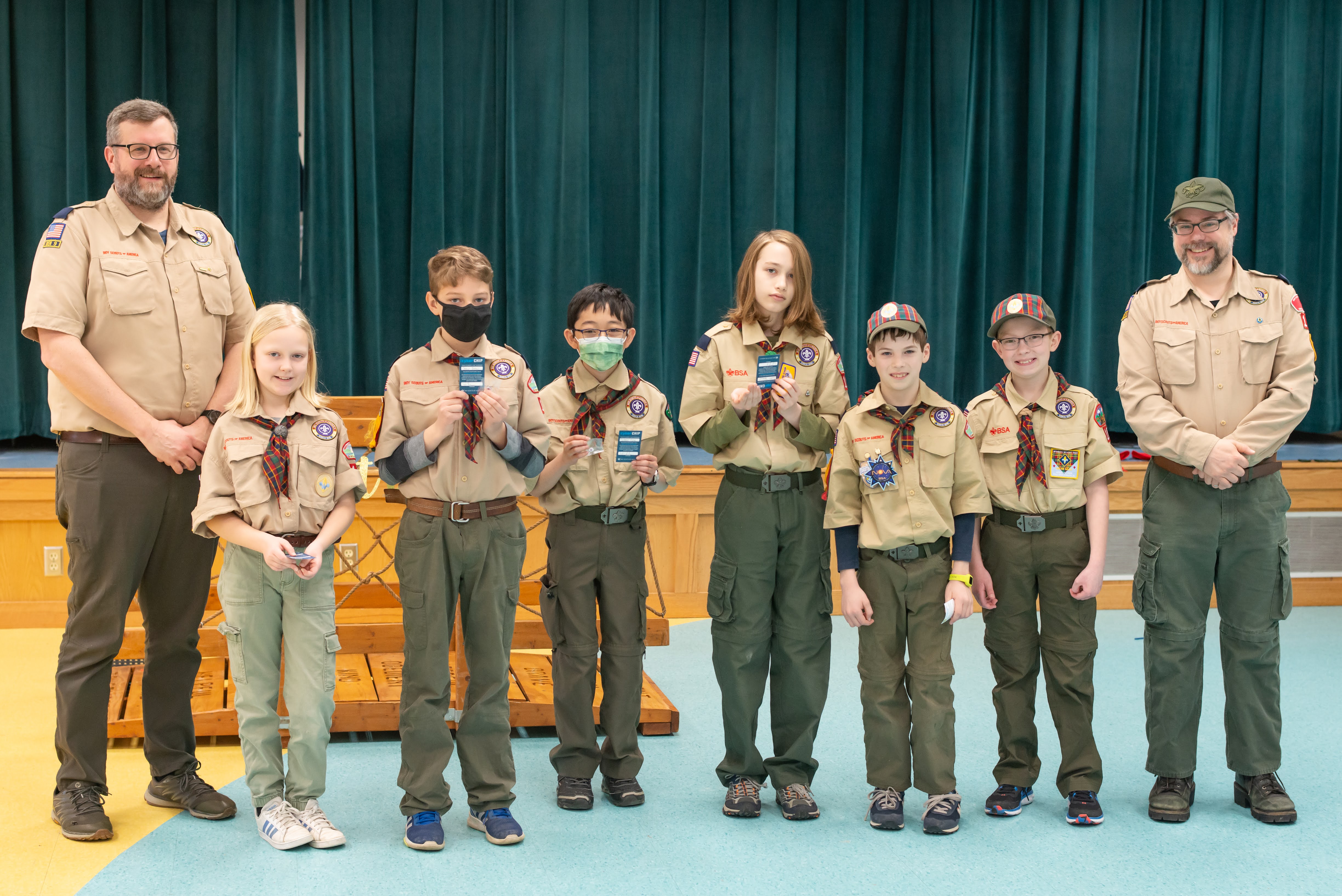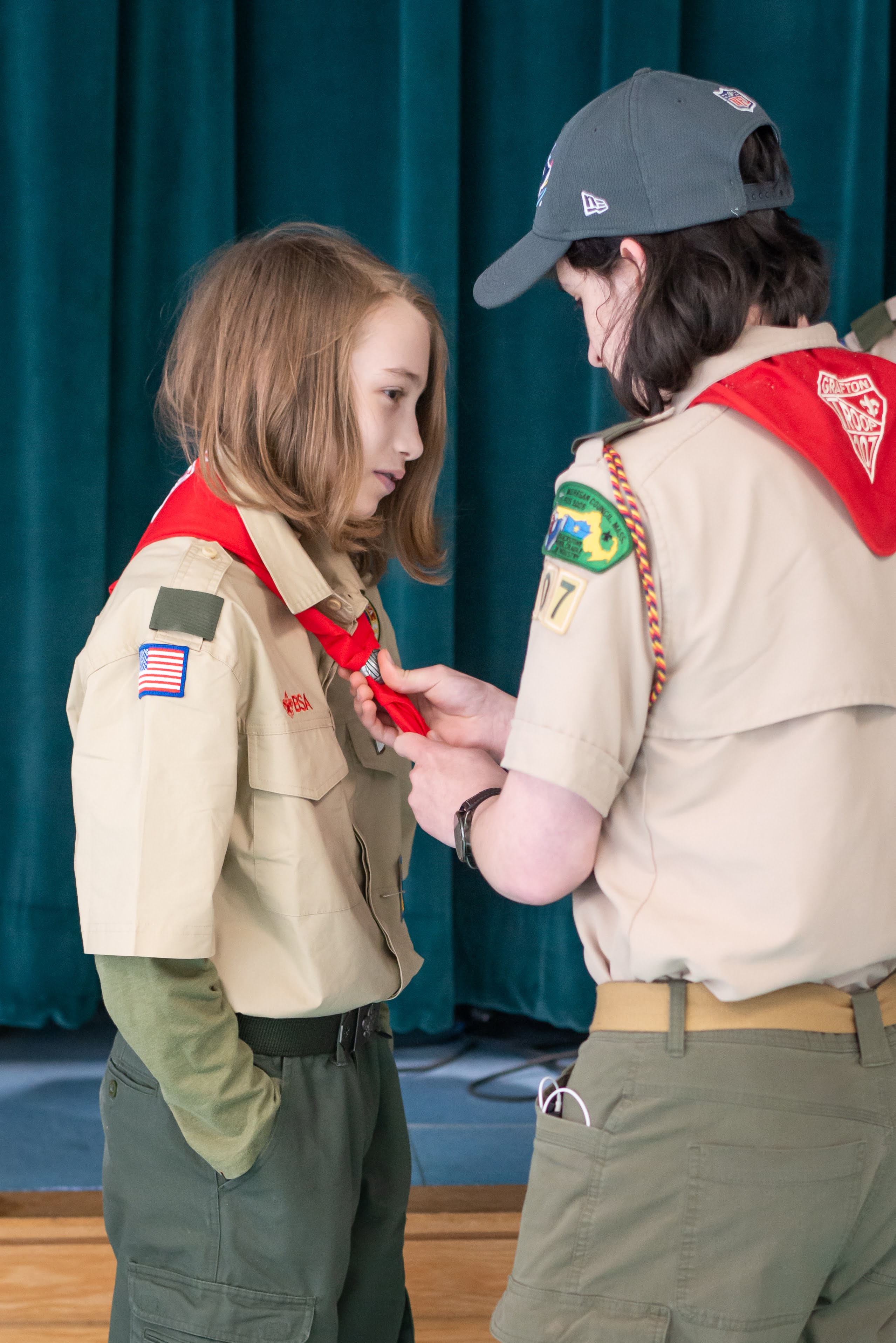 This year we have 6 Arrow of Light Scouts, from Den 9 and Den 19, who have achieved this rank. Congratulations go out to Joseph D., Gabriel F, Lukas H., Samuel G., Ailsa G., and Owen T. Den 9 is a milestone Den which started in 2016 with the addition of the Lion Year Pilot program , with Joseph D., and Gabriel F. who have been through the program since the Den’s inception, Samual G. joined Den 9 at the Start of the Tiger Year, Lukas H., joined at the beginning of the Wolf Year, and Owen T. joined Cub Scouts as a Wolf in New Jersey, and joined our Pack and Den in the beginning of the Arrow of Light Year. Den 19 is also a milestone Den, which is the year that girls were allowed to join Cub Scouts, and we celebrate Ailsa G, who joined at her Tiger Year in Millbury, and joined our Pack and Den in her Bear Year. Each Scout was handed an Arrow of Light Pin to give their parents to thank them for helping and guiding them along their Scouting journey. Parents were given an Arrow of Light patch to pin onto their Scout’s uniform. This is the only Cub Scout rank badge that can remain on the Scout’s uniform throughout their Scouts, BSA journey. Each Scout is then awarded their special Arrow plaque award that contains an arrow with custom attached special colored bands that represent, awards, ranks, and adventures that they have earned during their Cub Scout Journey. These colored bands are custom tied by our Cubmaster, Mrs. Tabitha Lefrancois.