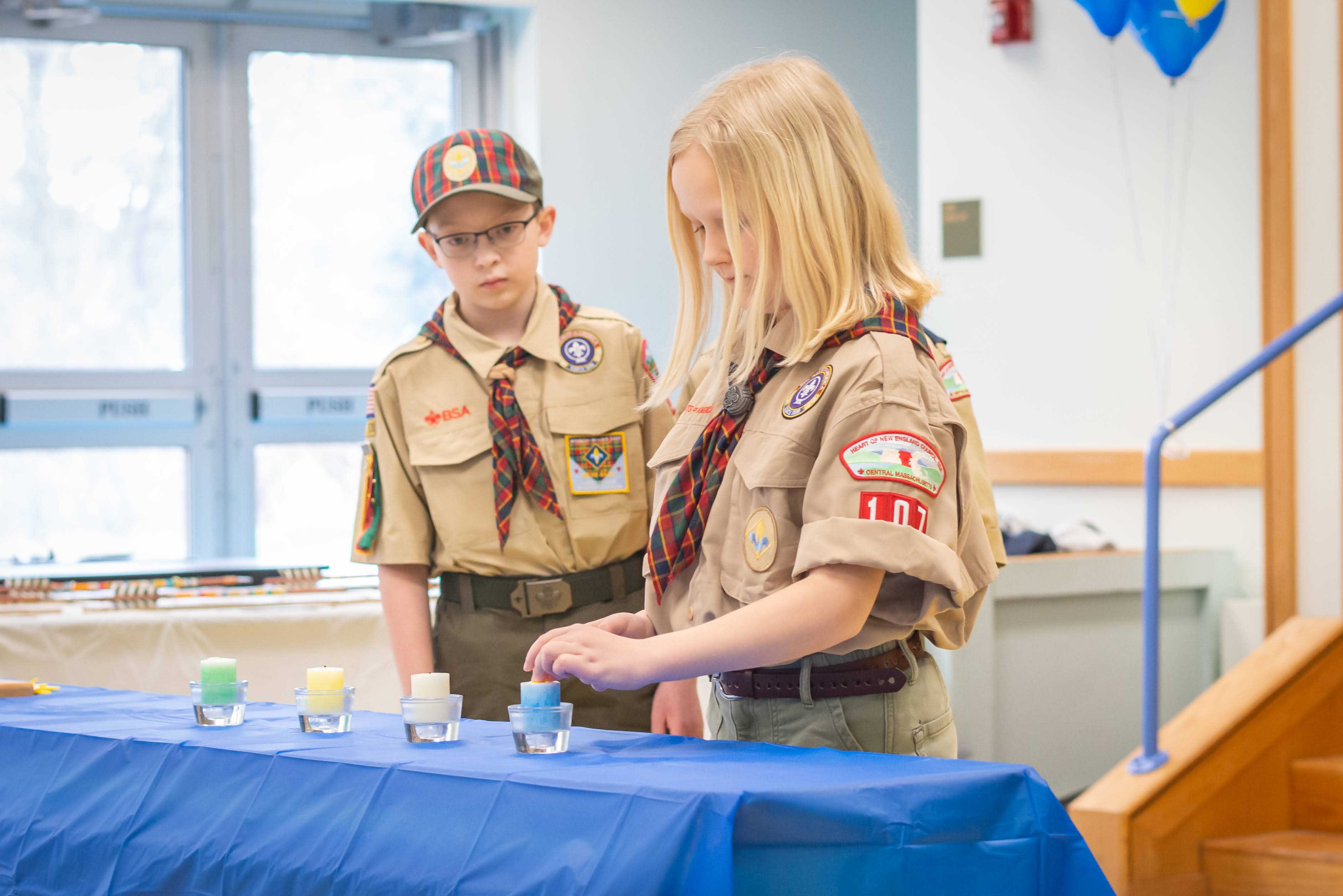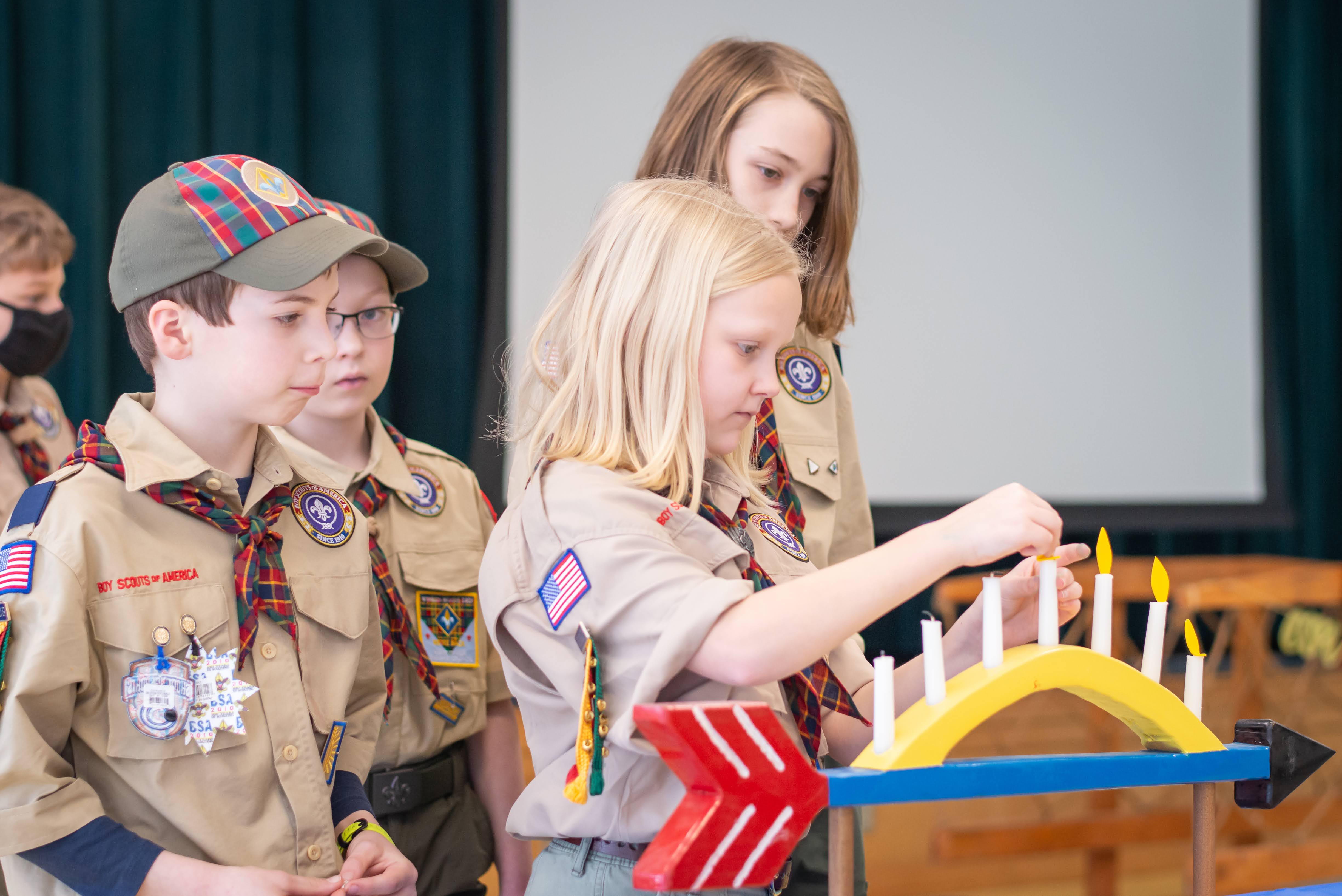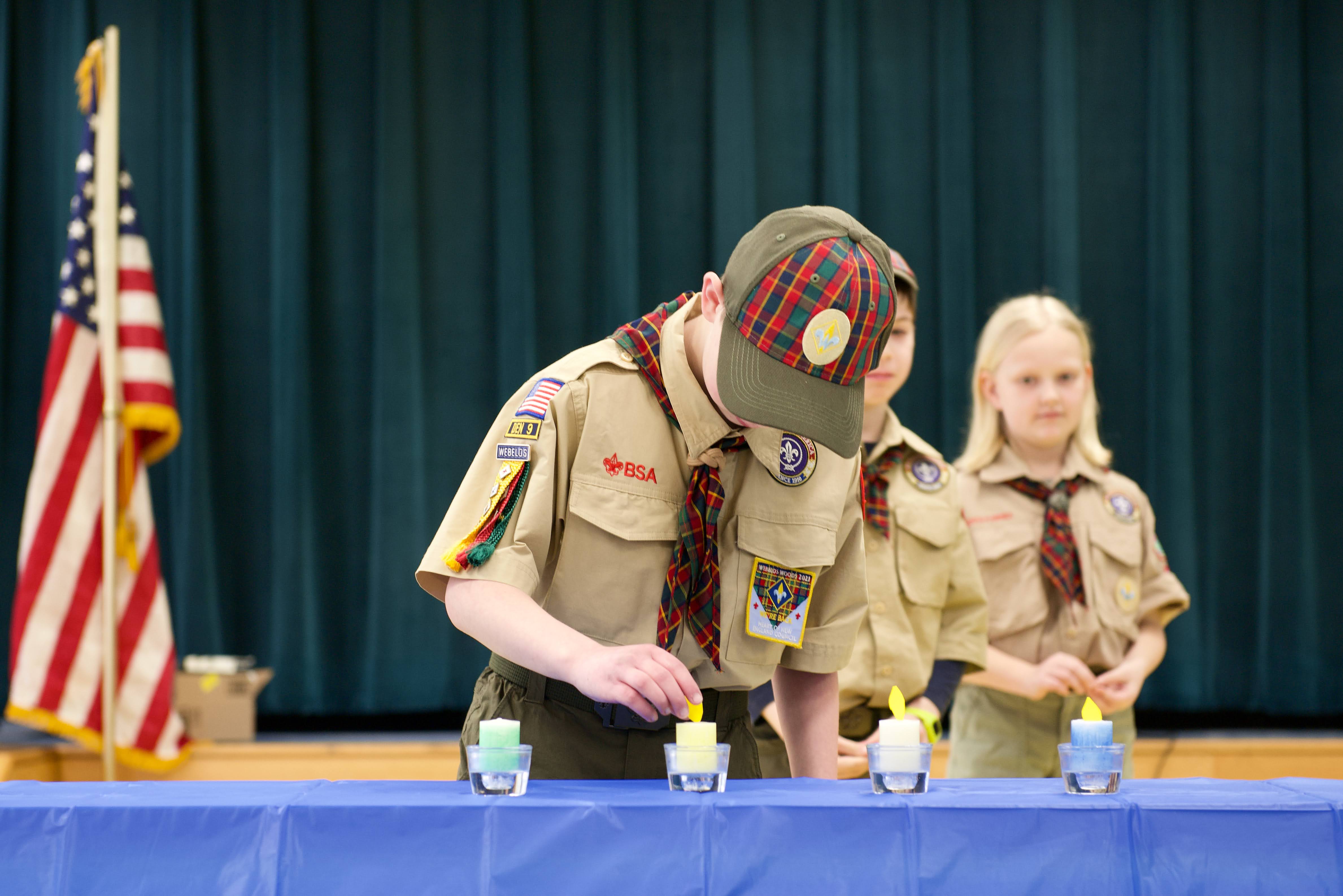 Our AOL Scout, Aisla G., Samuel G., and Lukas H., took turns “lighting” candles that represent the spirit of Cub Scouting: The blue candle, representing of giving goodwill and doing your best, the white candle, representing, the promise to fulfill the Scout Oath and Scout Law, the Cub SCout Motto, “Do your best”, the yellow candle , representing the entire Scouting movement is one of service, high ideals and fellowship, and the green unlit candle, representing, the Scouts, BSA Program, that there is more adventure ahead as you continue on your journey along the Scouting trail.