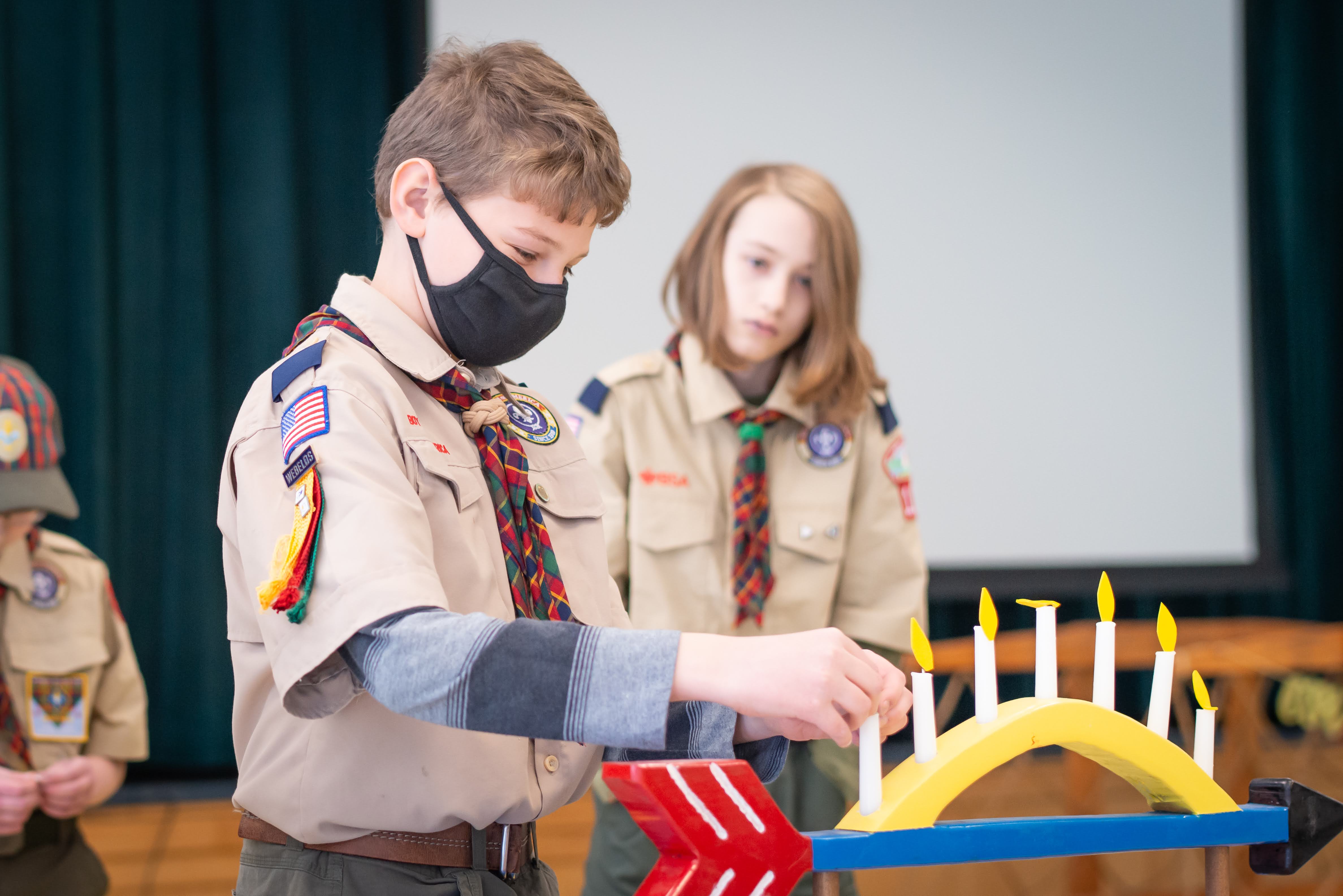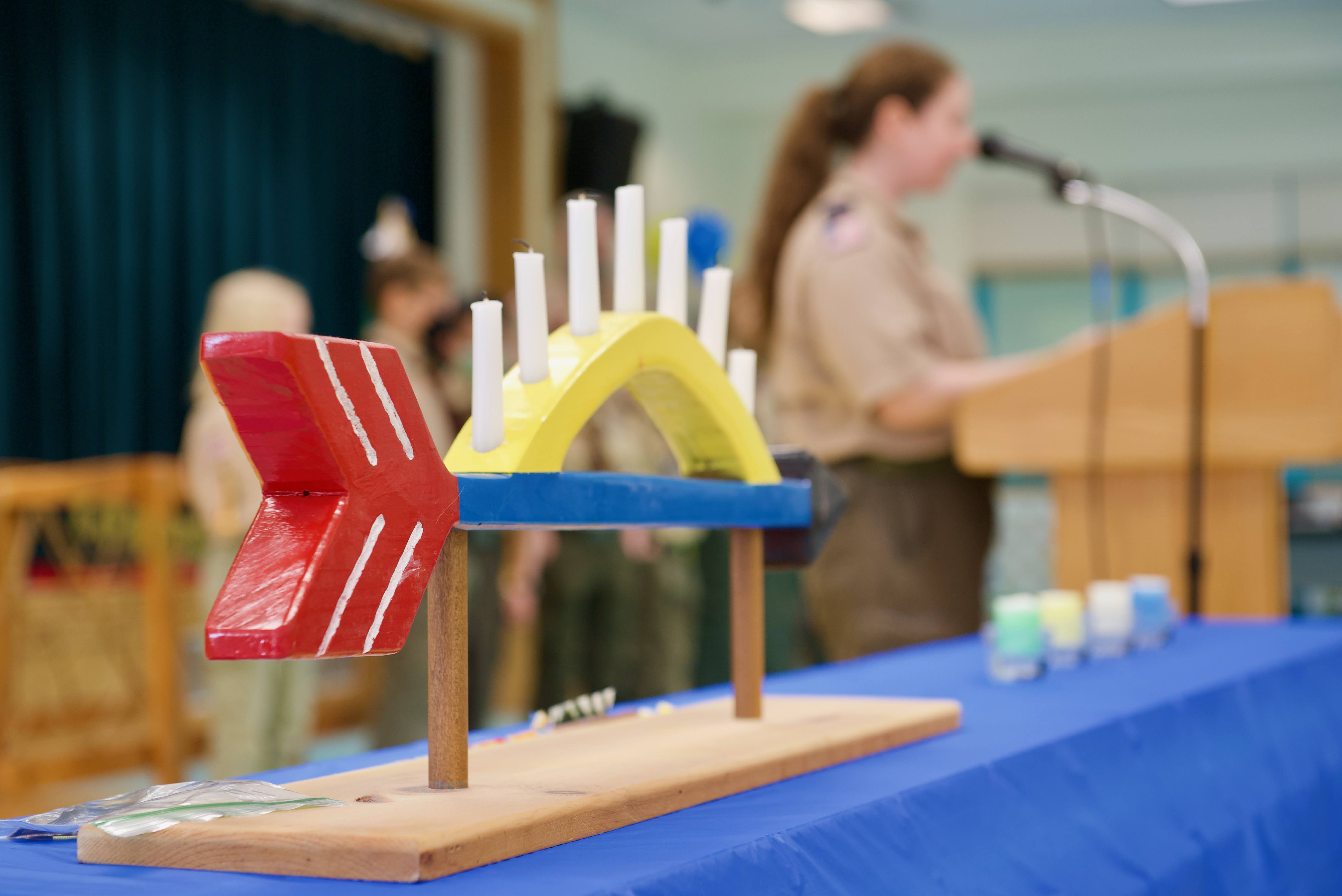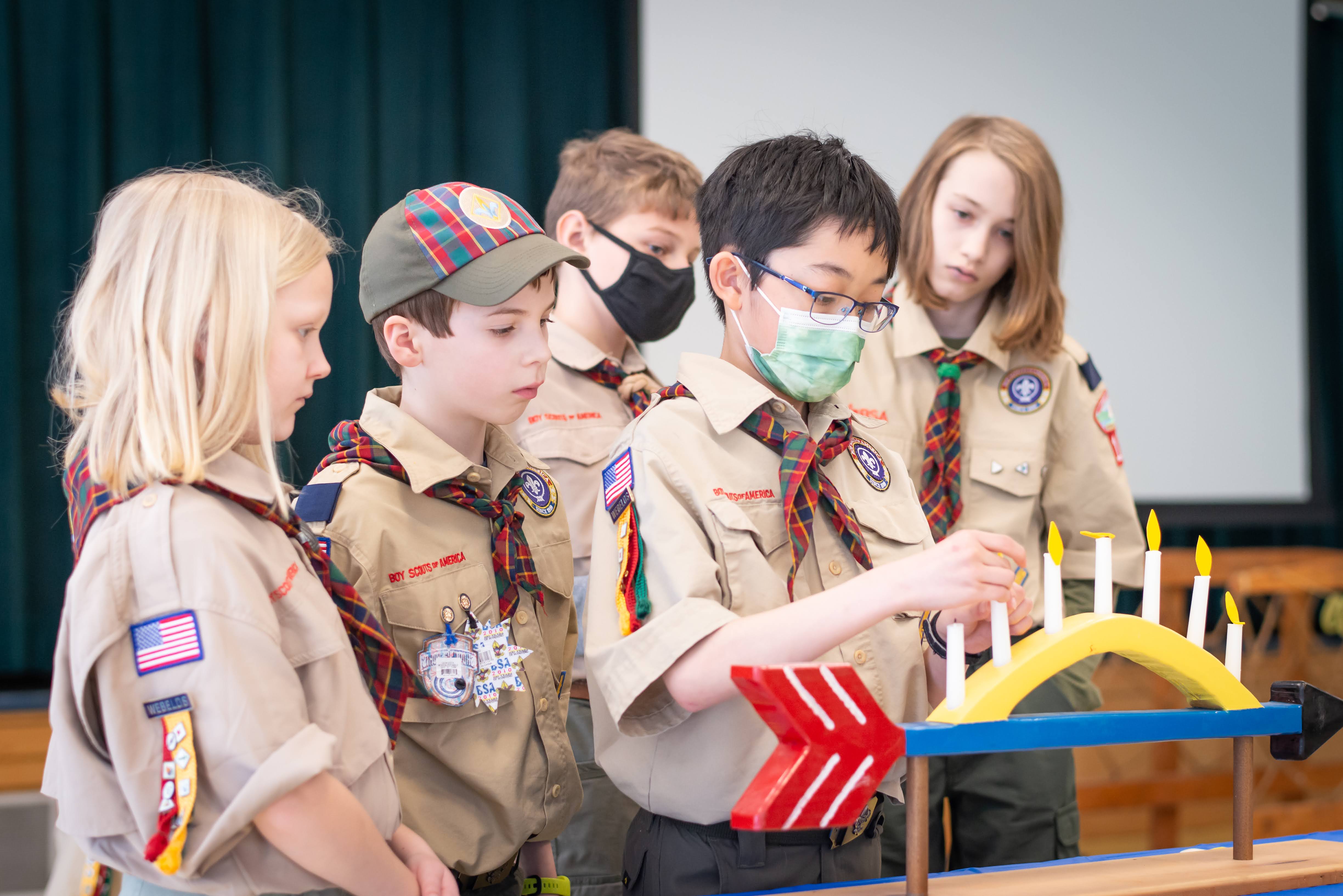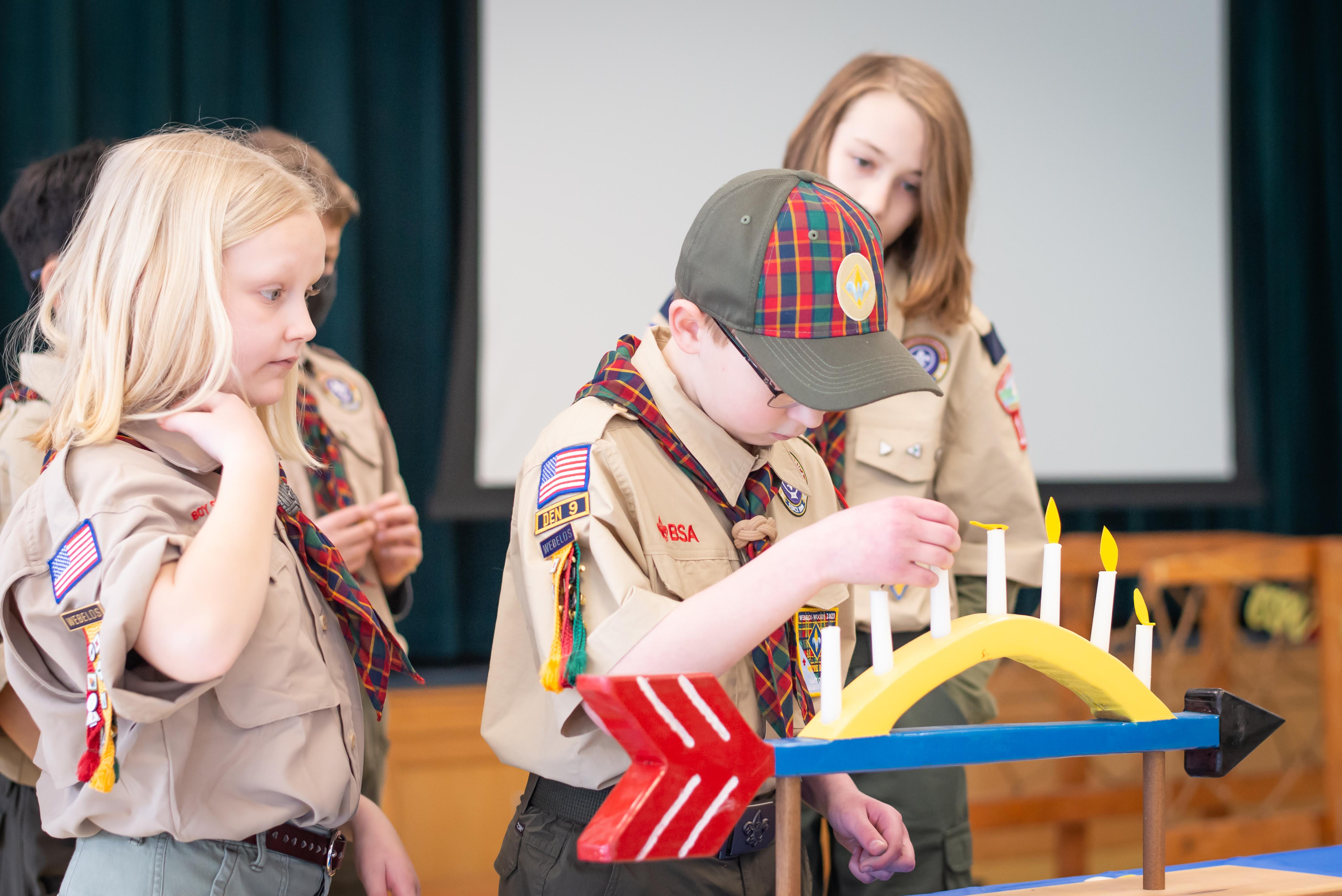 Our AOL Scout, Aisla G., Samuel G., and Lukas H., took turns “lighting” candles that represent the spirit of Cub Scouting: The blue candle, representing of giving goodwill and doing your best, the white candle, representing, the promise to fulfill the Scout Oath and Scout Law, the Cub SCout Motto, “Do your best”, the yellow candle , representing the entire Scouting movement is one of service, high ideals and fellowship, and the green unlit candle, representing, the Scouts, BSA Program, that there is more adventure ahead as you continue on your journey along the Scouting trail.