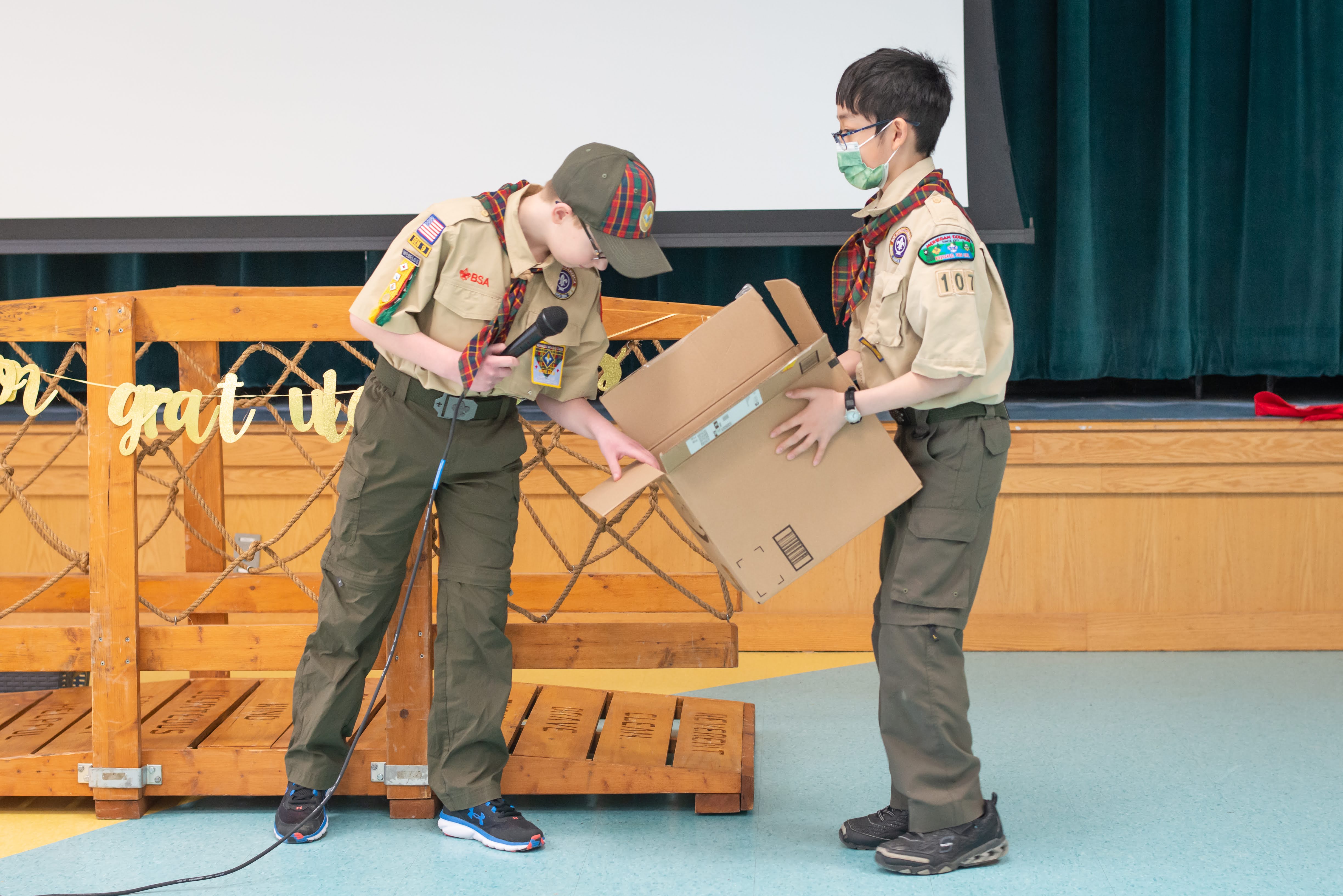 A special and touching speech by our Cubmaster, Ms. Tabitha Lefrancois, followed. She announced that this was her first and last time hosting Blue and Gold Banquet and Ceremony as Cubmaster, and that she plans to retire from her position after the Pack Advancement Ceremony on June 18, 2022. Ms. Tabitha began her journey with Pack 107 when her son, Kaleb joins as a Tiger in 2014. Ms. Tabitha served as Pack Secretary, Lion Den leader, Assistant Cubmaster, and became Cubmaster in 2019. Mr. Larry Drew, who just retired as Assistent Den Leader for Den 9 and Den 19, will take on the position of Co-Cubmaster, and will become the official Cubmaster on June 18th.
