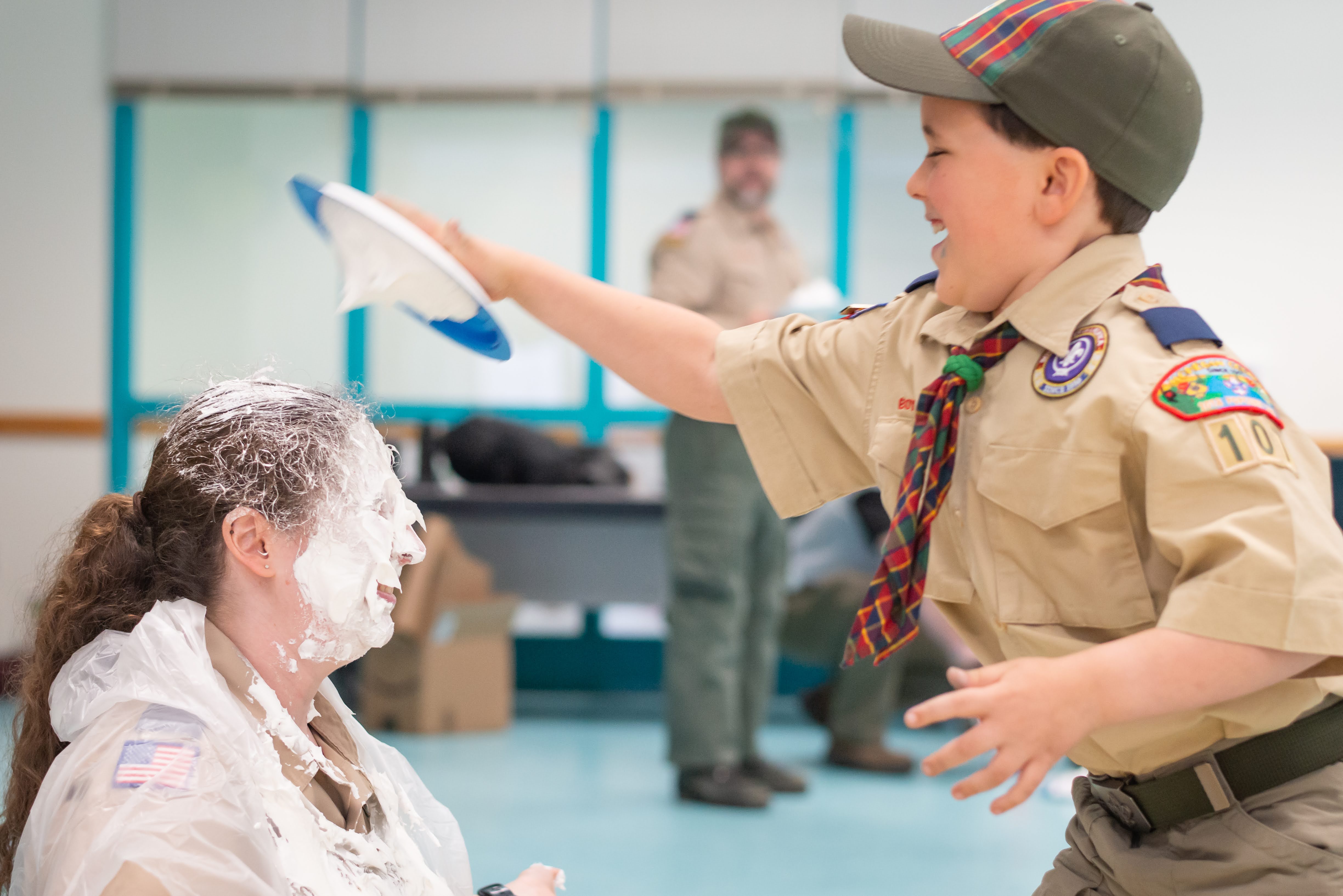 We cannot forget, an huge and heartfelt thank you to Mr. King, Scoutmaster of Troop 107, and Mrs. Tabitha for accepting pies in the face as awards for our top Scout Popcorn sales/fundraisers. Every Scout that raised more than $525 go to put a pie on Ms. Tabitha’s face. Congratulations these 11 csouts: Gabriel R., Andrew N, Nico F., Lilly G., Nathaniel R., Jimmy C., Samuel G., Gabriel F., Ollie N., Jasmine B, and our top seller/fundraiser, Matthew L.