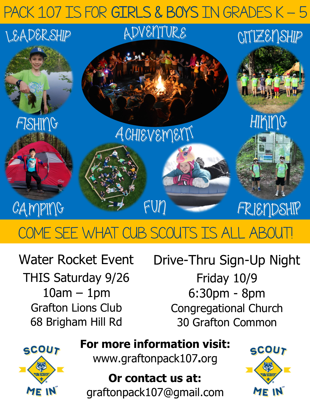 On Saturday, September 26, 2020 10AM-1PM, we will be having our Water Rocket Lunch at the Grafton Lion’s Club Field, 68 Brigham Hill Rd, Grafton, MA. This is a great event for those who want to join Pack 107, find out more about Cub Scouting, and if you have a friend who is interested, please invite them along!!